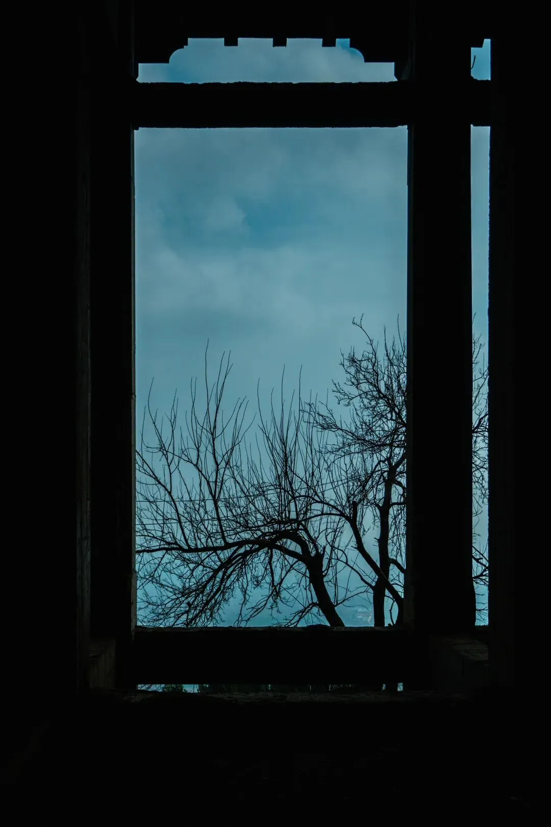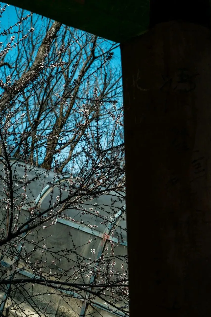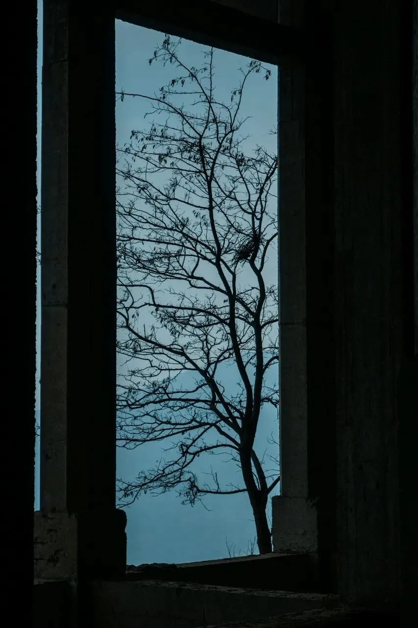 拍摄技巧:利用框架构图,将枯树、远山框进窗洞,冷调蓝绿滤镜 + 低饱和,拍出末日废土风