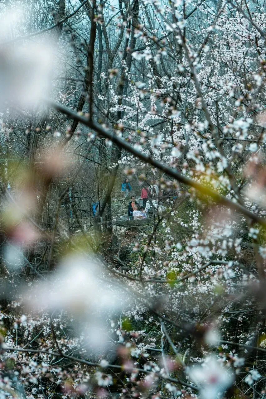 拍摄技巧:用前景花枝做虚化,框住林间行人,营造 “人在画中游” 的春日意境