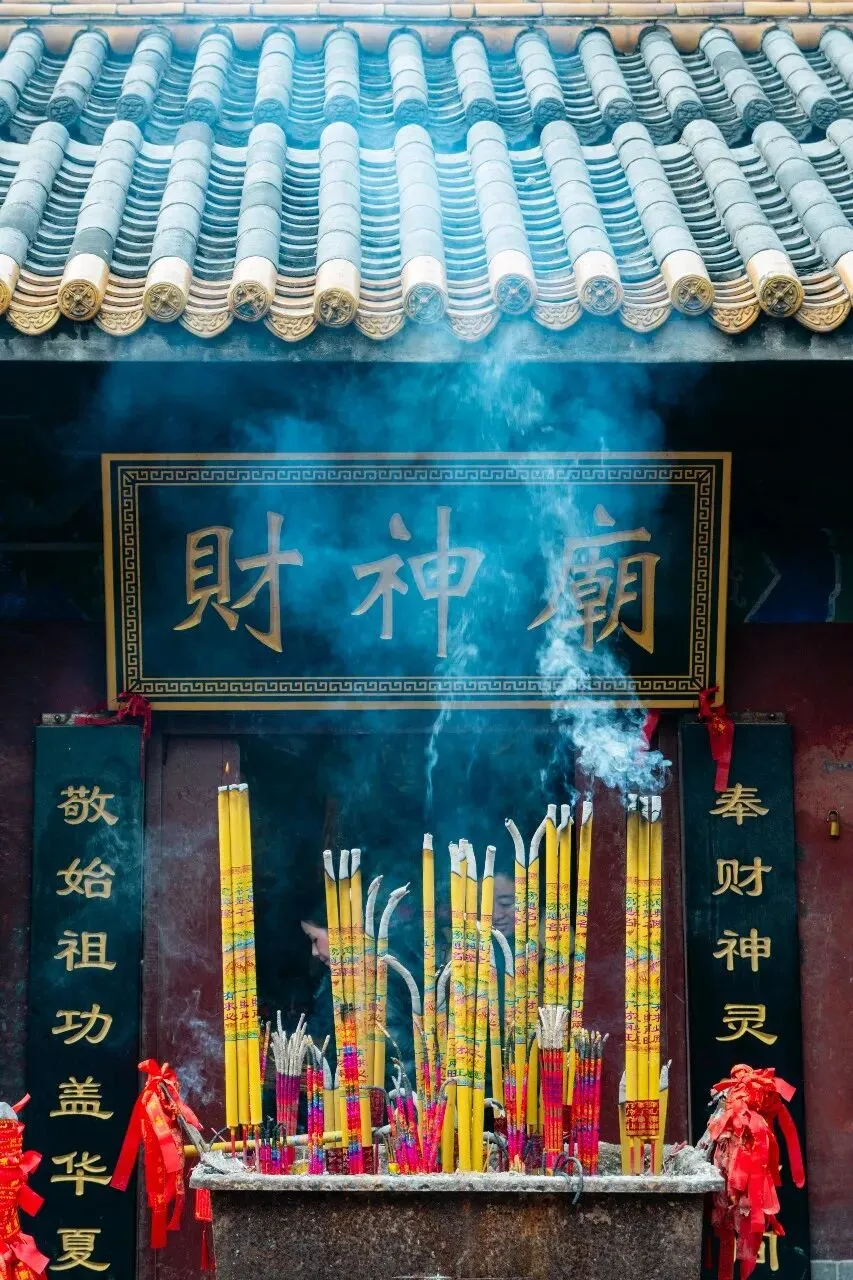 拍摄技巧:捕捉香火缭绕的瞬间,利用对称构图,让牌匾与香炉在画面中居中,增添庄重感