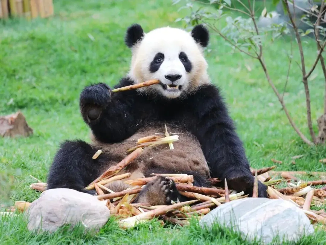 看 “娇奥”“双雄” 啃竹、打滚、爬树,