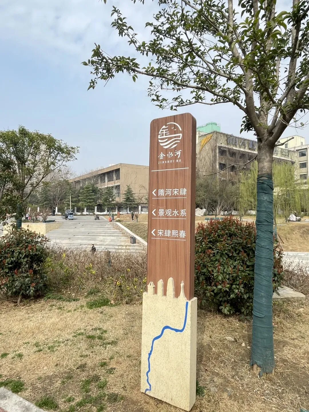 市党史馆,省图书馆,当年的郑州粮食学院成河工大老校区,一路都是回忆金水河串起了老郑大和老粮院。见金水河就到了今儿的目的地 隋河宋肆。 隋河宋肆位于郑州市金水河畔,嵩山路与陇海路口西北角,是金水河滨河公园内一处具有浓厚历史文化意蕴的仿古建筑群。“隋河”:指隋朝的大运河及通济渠,郑州曾是其重要水陆枢纽,“商旅往返,舟船不绝”。