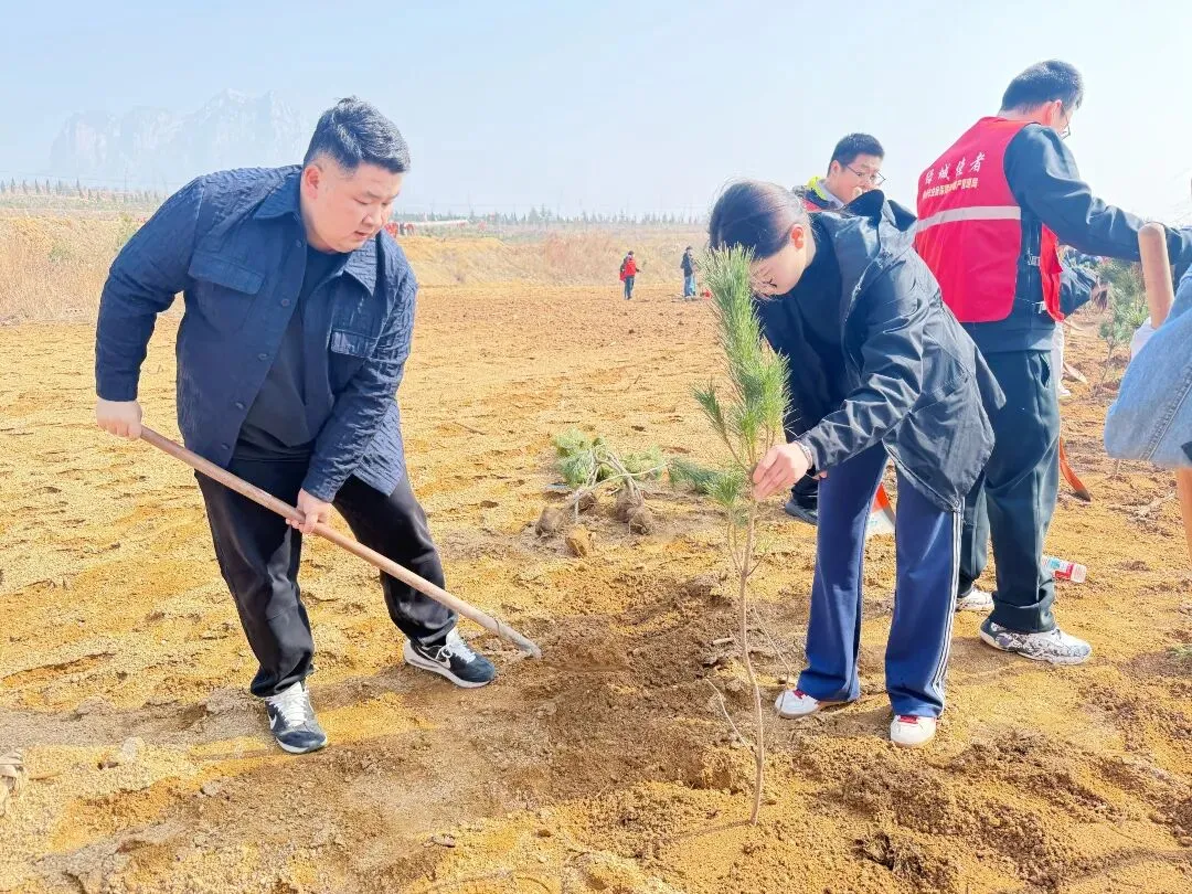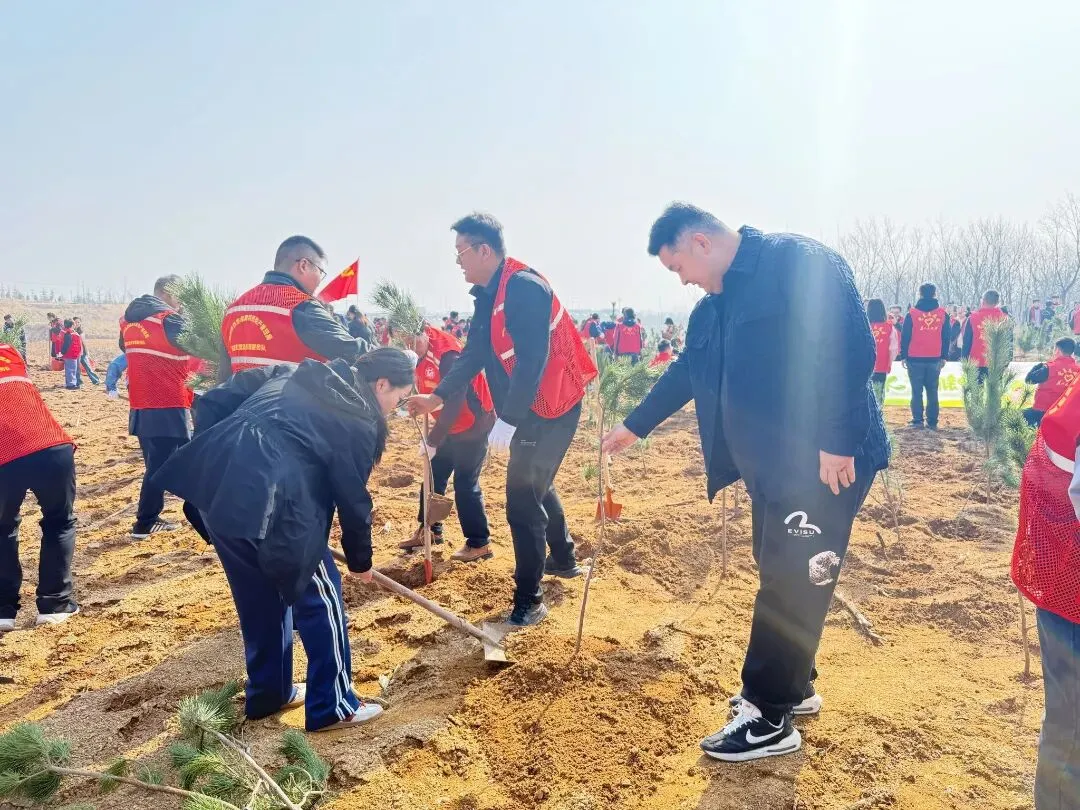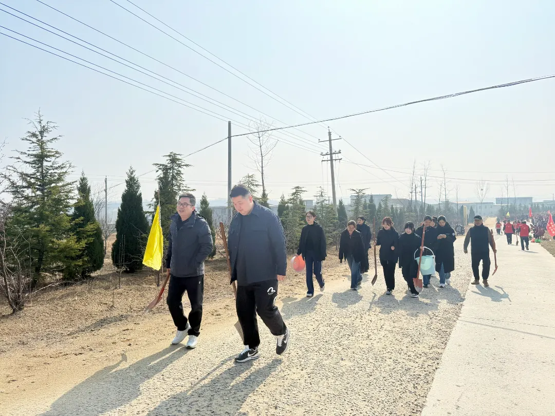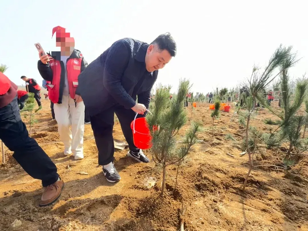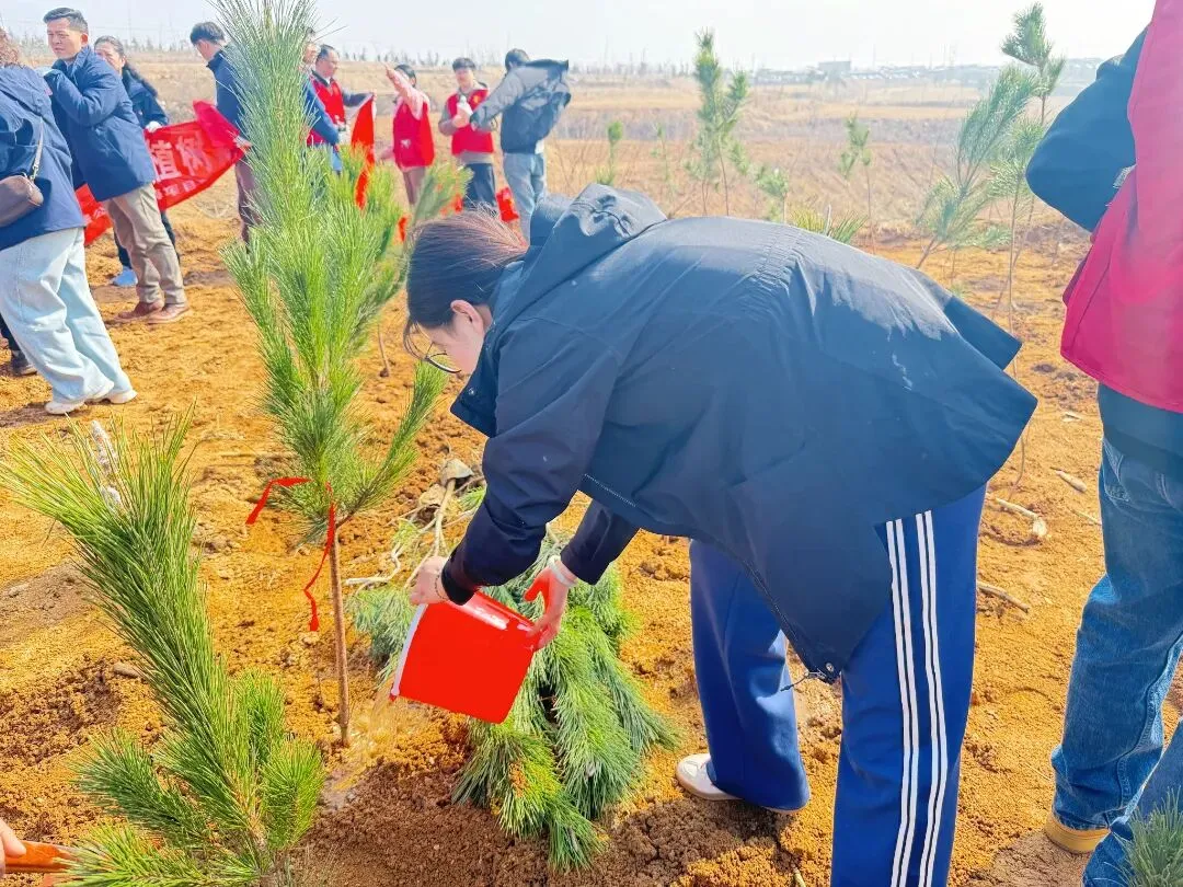 当天的植树基地一派热火朝天的劳动景象。迎着和煦的春风,大家三五一组,分工协作,扶苗、培土、踩实、浇水,每一个环节都认真细致、有条不紊。一排排新栽的树苗迎风挺立,错落有致,在明媚的春光中焕发出勃勃生机,为初春的大地增添了一抹盎然绿意。