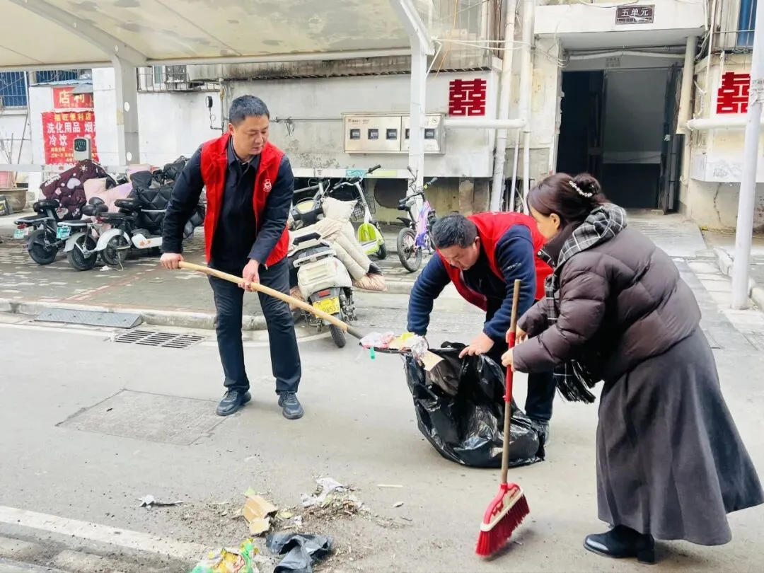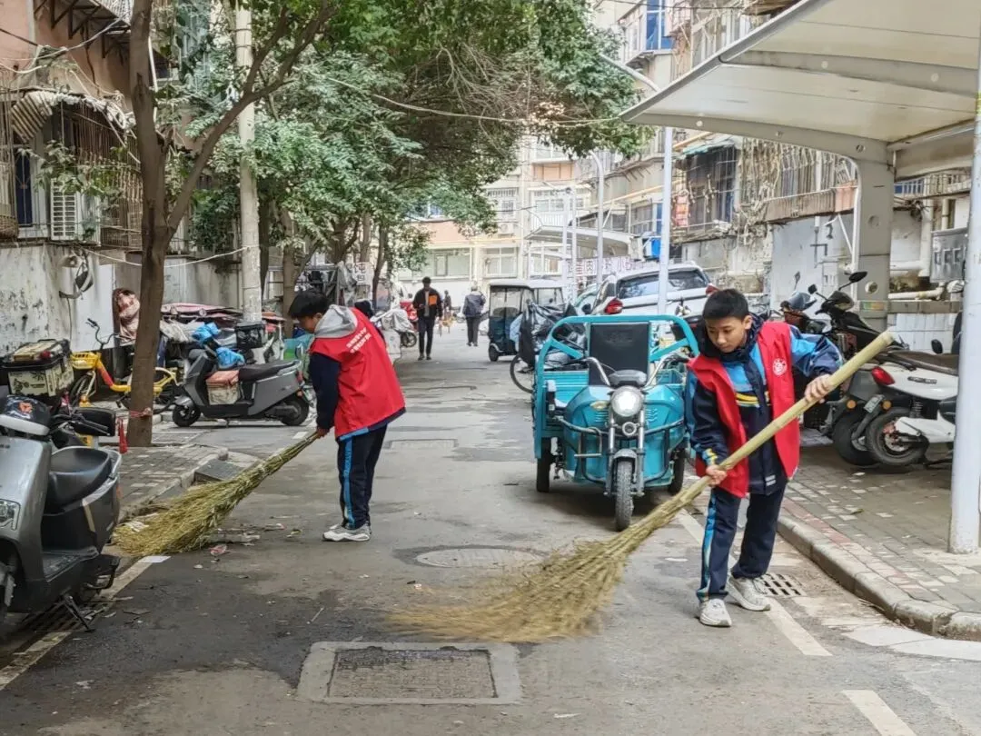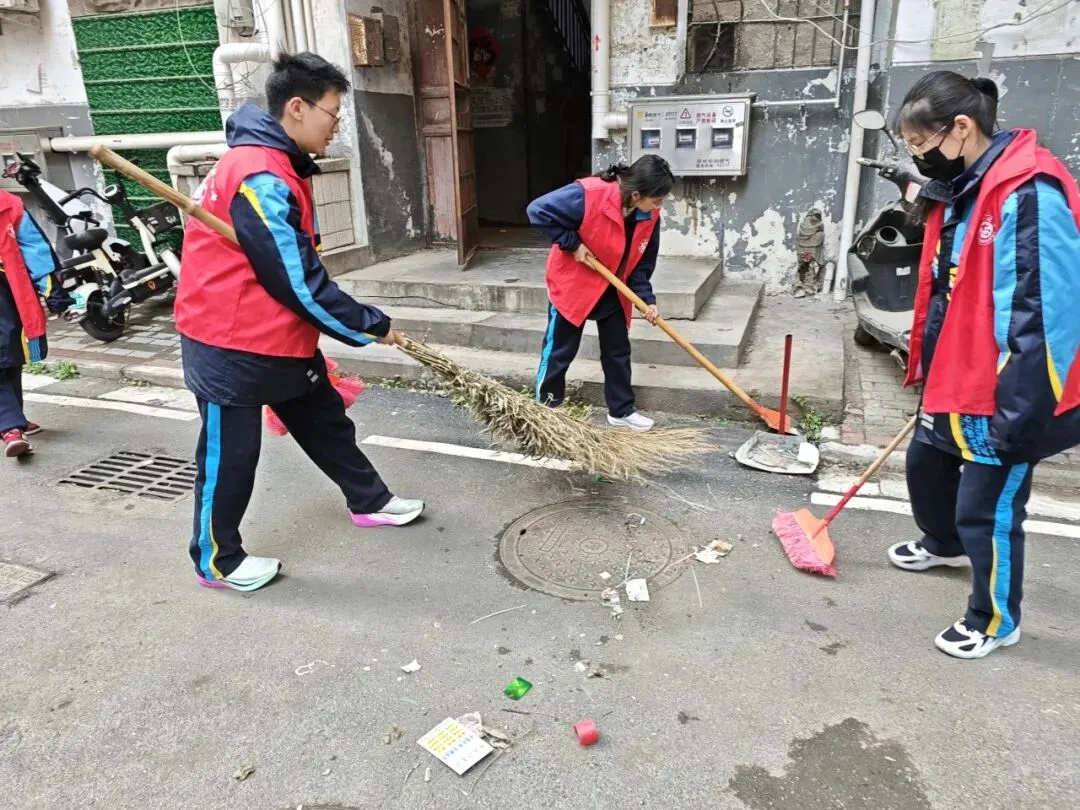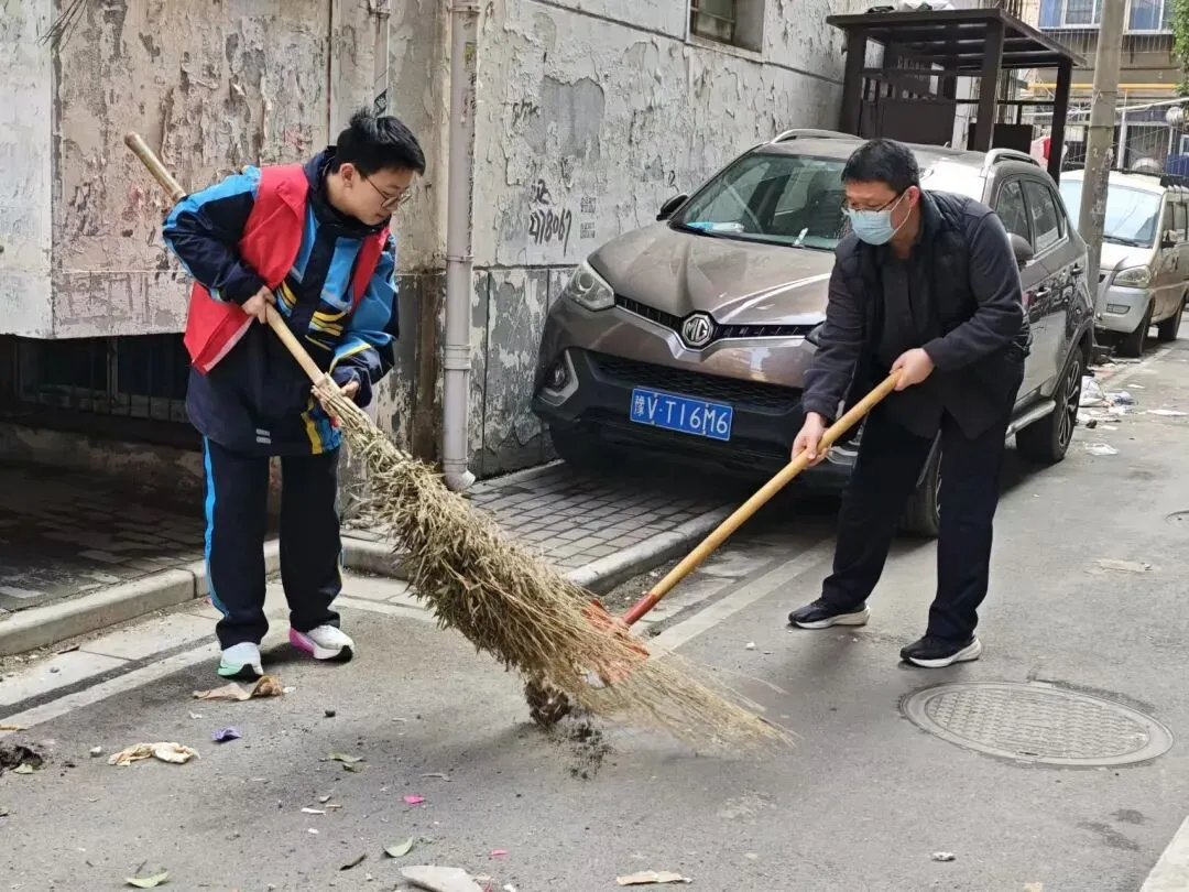 活动现场,师生们热情高涨、干劲十足。大家分工协作、配合默契,有的清扫路面纸屑、塑料袋等生活垃圾,有的俯身捡拾角落隐藏杂物,有的整理乱堆乱放物品。同学们不怕脏、不怕累,认真细致、不留死角,用双手为社区“梳妆美颜”;学校领导全程参与、率先垂范,与学生一同劳动,在实践中言传身教,传递责任与担当。一抹抹志愿红穿梭在社区街巷,成为春日里一道温暖而亮眼的风景。
