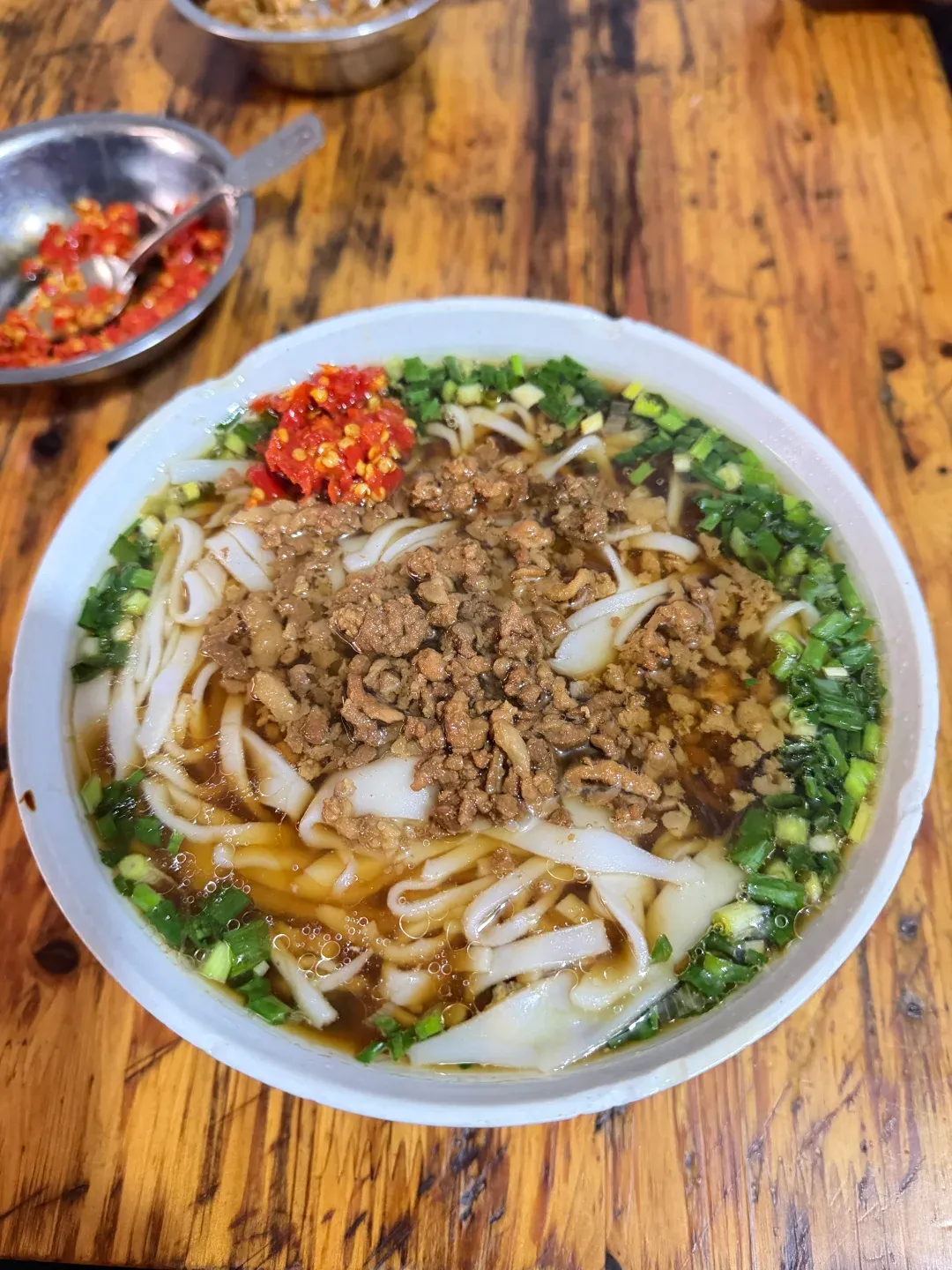 「一大桥下的无名粉馆」 花销:12元 Tips:一定要加一勺老板自家剁的白辣椒,那是这碗粉的灵魂。