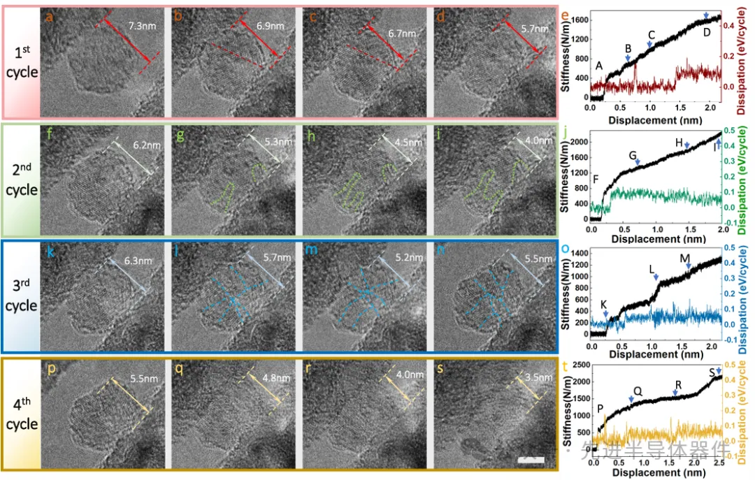图 2.金刚石纳米粒子的塑性变形过程。该纳米粒子经过四次压缩以研究其变形机制。a-e、f-j、k-o 和 p-t 分别展示了第一次、第二次、第三次和第四次压缩周期的透射电子显微镜图像以及相应的力-位移响应图。g-i 中的虚线突出显示了压缩过程中的无定形区域。l-n 中的虚线标记了由无定形碳网络将纳米粒子分割成小颗粒的位置。A-D、F-I、K-M 和 P-S 在 e、j、o 和 t 中的标注对应于 a-e、f-j、k-o 和 p-t 的透射电子显微镜图像采集时刻。分别地;各自地刻度标尺的长度为 3 纳米。