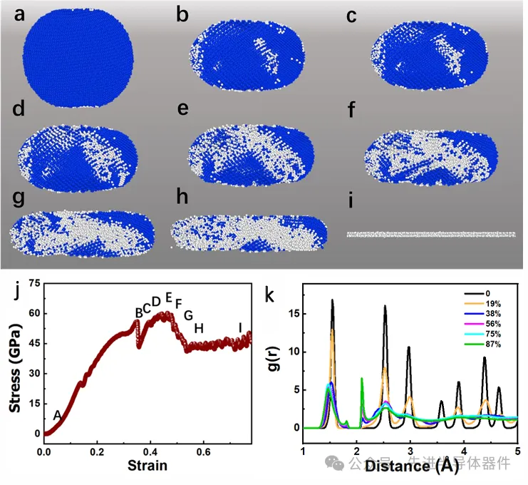 图 3.金刚石纳米粒子压缩的分子动力学模拟及其相应的力响应情况。a-i 金刚石纳米粒子在压缩过程中的提取结构。蓝色球代表金刚石中的碳原子,白色球代表非晶态碳原子。本地的非晶化过程随着非晶区域的扩大而进行,这些区域将纳米颗粒包裹成小的金刚石颗粒,并最终导致完全的非晶化,标尺为 2 纳米。J 模拟应力应变曲线,该曲线考虑了压缩过程中横截面的变化。A - I 分别对应于分子动力学模拟中提取的结构(a - i)。K 金刚石纳米颗粒在 0%、19%、38%、56%、75% 和 87% 压缩应变下的径向分布函数(RDF)分析。RDF 的演变表明,随着压缩的进行,非晶碳含量逐渐增加,证实了应变诱导的结构转变。