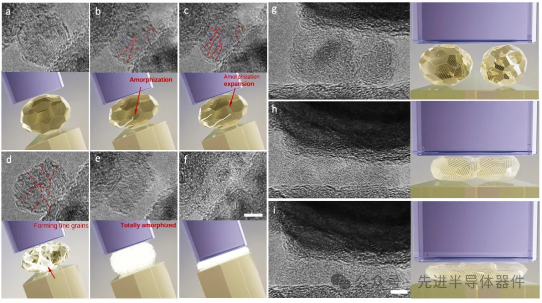 图 5. 小于 10 纳米的金刚石纳米颗粒的压缩塑性机制及其在纳米级组装中的应用。变形阶段包括:a 原始纳米颗粒发生弹性变形。b 非晶化的开始。c 非晶化区域的扩展和增多。d 细小晶粒的形成和移动。e 纳米颗粒的完全非晶化。f 一个压缩至原子层厚度的金刚石纳米颗粒的超大塑性变形,比例尺为 3 纳米。g - I 原子力显微镜图像及相应的图示展示了在压缩作用下两个金刚石纳米颗粒融合成一个纳米颗粒,突显了其在纳米级金刚石器件制造中的潜在应用。比例尺为 3 纳米。在原子力显微镜图像中,红色虚线轮廓表示非晶化区域,蓝色虚线轮廓表示晶格条纹,“┬”标记表示位错。在示意图中,压缩系统的紫色和米色部分分别表示可移动的金刚石压头和固定的金刚石压头。