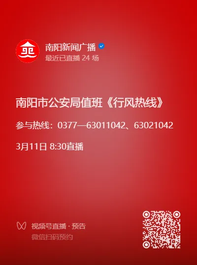 3月11日8:30—9:30南阳市公安局党委委员、政治部主任高青带队值班《行风热线》,主要介绍2026年我市公安机关工作部署情况。