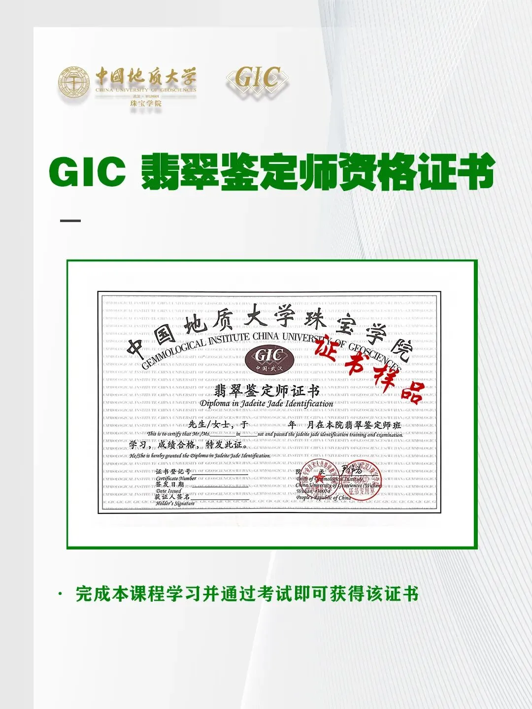 学习期满经考试合格者,能获得由中国地质大学(武汉)珠宝学院统一颁发的"GIC翡翠鉴定师证书"。