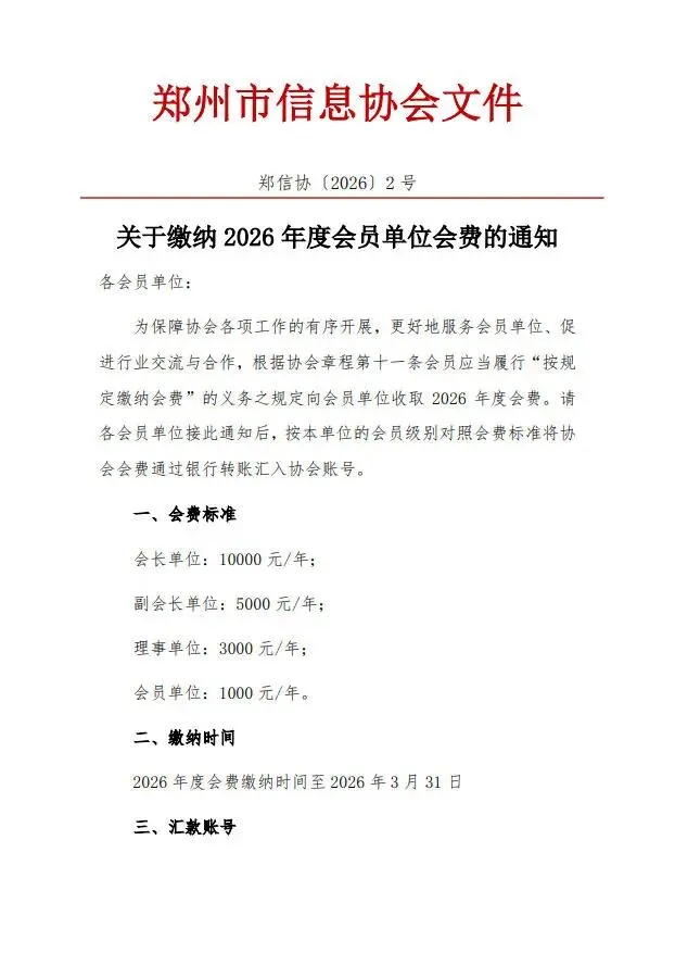 >郑州市信息协会关于缴纳2026年度会员单位会费的通知
