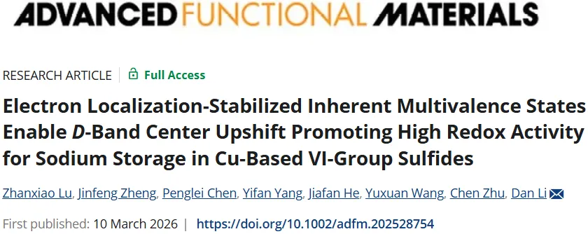 2026年03月10日,郑州大学李丹团队在Advanced Functional Materials期刊发表题为“Electron Localization-Stabilized Inherent Multivalence States Enable D-Band Center Upshift Promoting High Redox Activity for Sodium Storage in Cu-Based VI-Group Sulfides”的研究论文,团队成员Lu Zhanxiao为论文第一作者,李丹为论文通讯作者。
