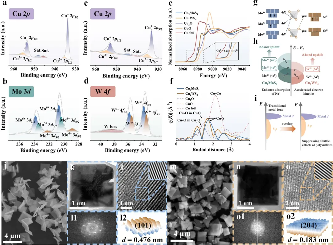图 1 | Cu₂MoS₄的(a) Cu 2p 和 (b) Mo 3d XPS谱图;Cu₂WS₄的(c) Cu 2p 和 (d) W 4f XPS谱图;(e) Cu₂MoS₄、Cu₂WS₄及参考样品在Cu K-edge的XANES谱图;(f) Cu K-edge的k²加权EXAFS谱图的傅里叶变换;(g) 四面体场中不同价态Mo和W的d轨道电子构型;(h) 混合Mo⁴⁺/Mo⁵⁺/Mo⁶⁺和W⁴⁺/W⁶⁺态下d带中心上移的示意图;(i) 说明硫p轨道与过渡金属d轨道之间协同相互作用的能级图;(j) Cu₂MoS₄的SEM图像,(k) TEM图像,(l) HRTEM图像(其中1l和12分别为FFT图像和3D表面图);(m) Cu₂WS₄的SEM图像,(n) TEM图像,(o) HRTEM图像(其中0l和o2分别为FFT图像和3D表面图)。
