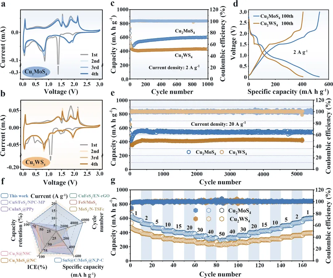 图 2 | 两种样品的电化学性能:(a) Cu₂MoS₄和(b) Cu₂WS₄在0.1 mV s⁻¹下的CV曲线;(c) 在2 A g⁻¹下的循环性能;(d) 第100圈的GCD曲线;(e) 在20 A g⁻¹下的长循环性能;(f) Cu₂MoS₄与已报道的Cu基和Mo基钠离子电池负极的循环性能对比;(g) 倍率性能。
