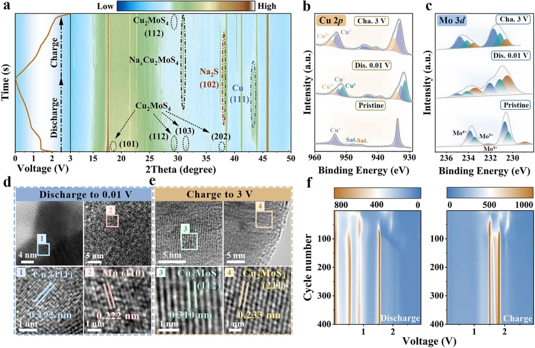 图 3 | Cu₂MoS₄的(a) 原位XRD图谱;(b) 高分辨率Cu 2p和(c) Mo 3d非原位XPS光谱(包括初始状态、放电至0.01 V和充电至3.0 V);在(d) 完全放电和(e) 完全充电状态下的HRTEM图像;(f) Cu₂MoS₄和(g) Cu₂WS₄在1 A g⁻¹下循环400次的2D dQ/dV等高线图。