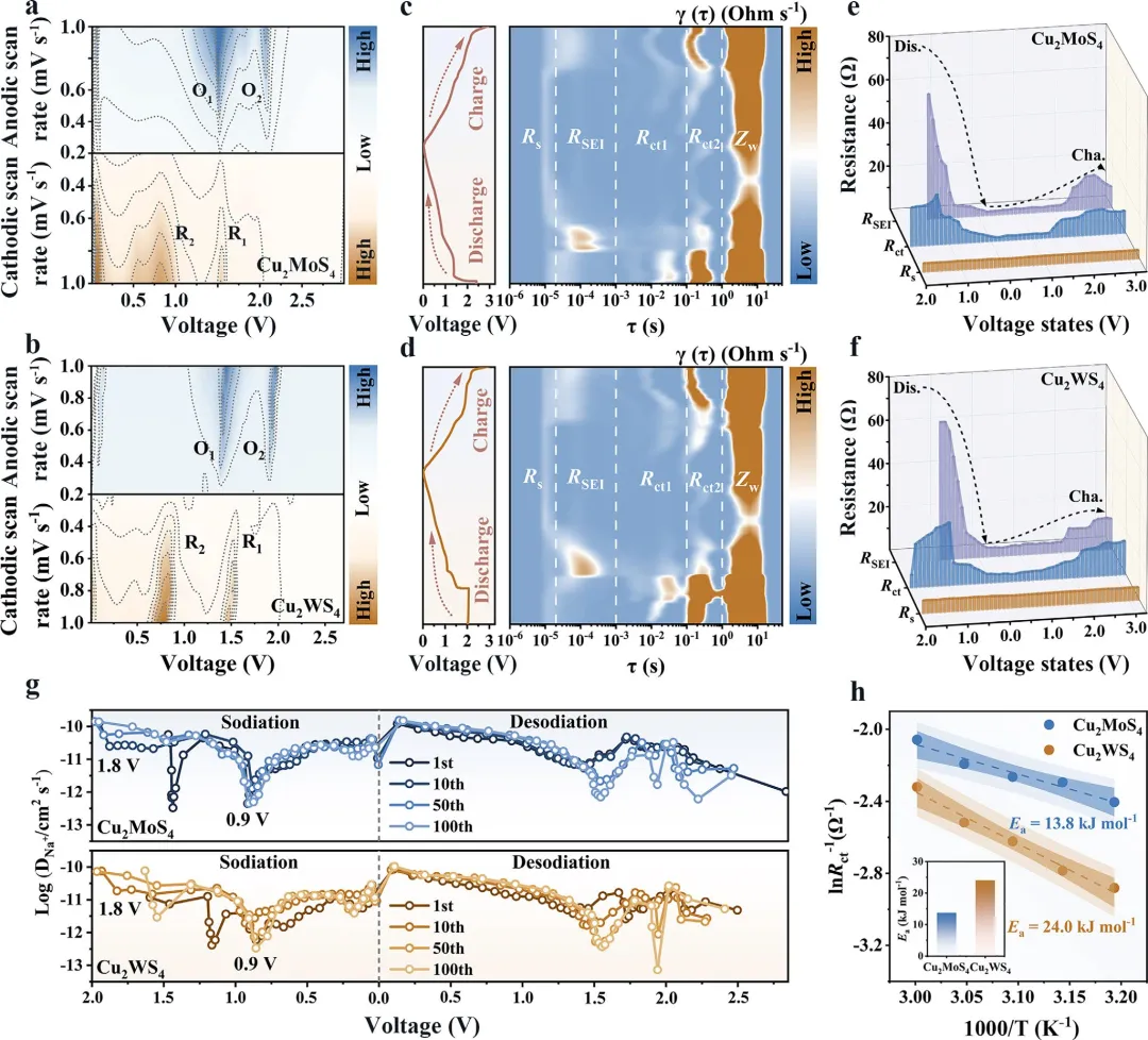图 4 | (a) Cu₂MoS₄和(b) Cu₂WS₄在不同扫描速率下的2D CV等高线图;由原位EIS导出的(c) Cu₂MoS₄和(d) Cu₂WS₄的2D DRT图,并与相应的GCD曲线同步;(e) Cu₂MoS₄和(f) Cu₂WS₄从DRT分析中量化的Rₛ、Rct和RSEI电阻;(g) 两种样品在首次循环中与电压相关的DNa⁺;(h) 计算的Eₐ值。