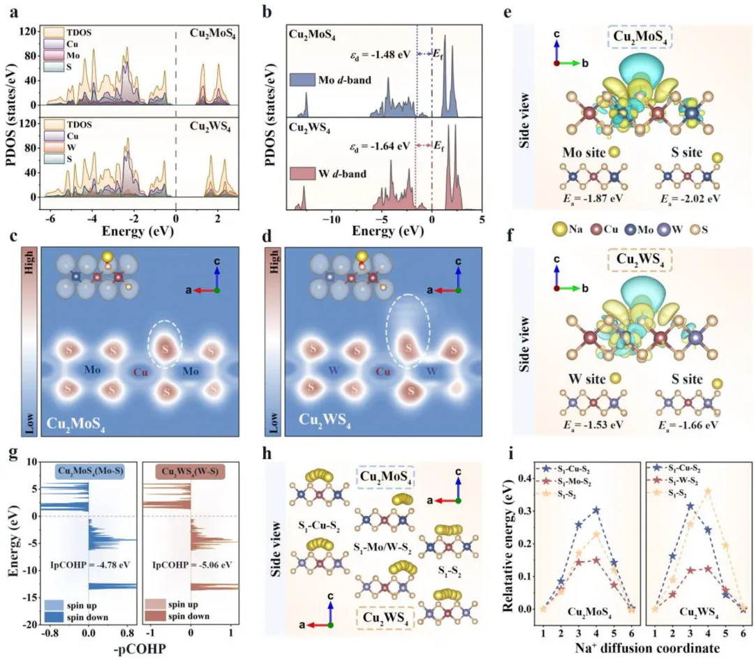 图 5 | 电子结构与成键分析:(a) 两种样品的TDOS和(b) d带中心能级;(c) Cu₂MoS₄和(d) Cu₂WS₄的ELF图;(e) Cu₂MoS₄和(f) Cu₂WS₄的差分电荷密度图及吸附位点侧视图;(g) Cu₂MoS₄和(h) Cu₂WS₄中M-S键的IpCOHP值;(i) 两种样品中Na⁺沿不同路径扩散能垒计算。