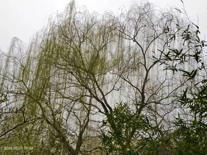 园亭之间,六曲阑干偎碧树,古旧阑干倚着抽芽的绿树,一静一动,一古一新,相映成趣。最是堤边杨柳惹眼,杨柳风轻,软风拂过枝头,纤柔枝条缓缓舒展,尽数抖落满枝黄金缕,嫩黄丝绦垂落,随风轻舞,像极了春日垂下的温柔帘幕。