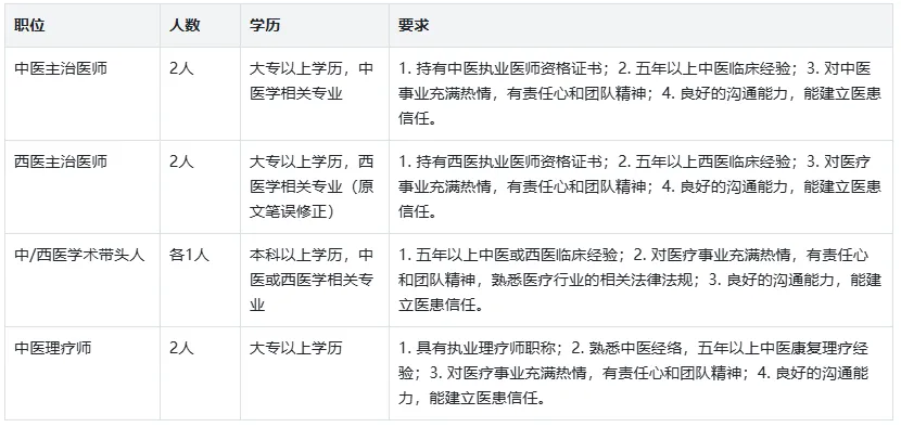 岗位:中医主治医师、西医主治医师、中/西医学术带头人、中医理疗师