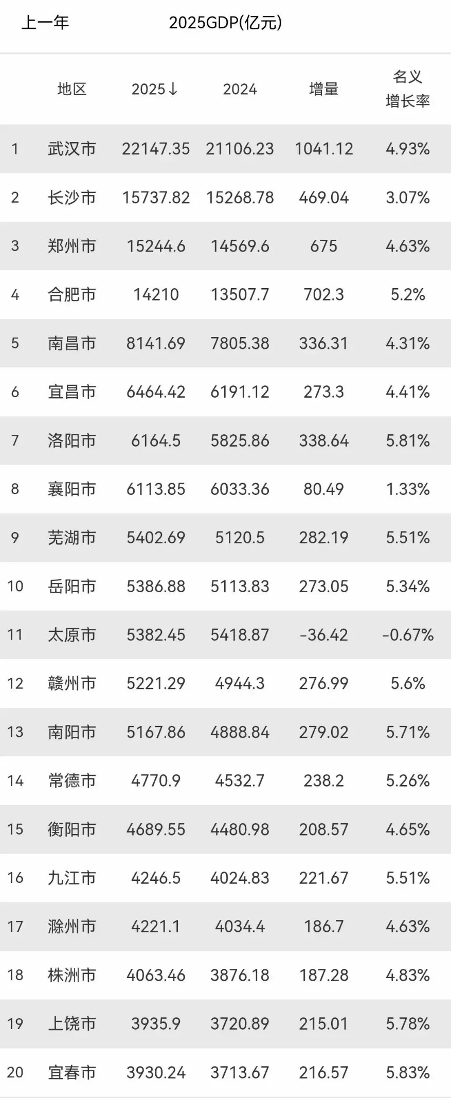 近日中部六省GDP20强城市最新经济数据已出,该榜单清楚地显示出各个城市2025年经济表现以及排名变化情况。从总体上看,中部地区城市之间的竞争日趋激烈,经济格局正在发生着静悄悄的改变。最引人注目的是郑州和长沙之间的差距不断缩小,两者GDP总额也越来越接近。同时襄阳的位置也有所下降,由上一年度的8名降为此次榜单中的8名。但是上饶却成功跻身于二十强之中,排在第十九位。不但能体现一个城市的经济活力,而且也能反映整个区域发展新的动向。接下来,根据具体的统计数据,逐个分析二十个城市经济发展情况及原因。