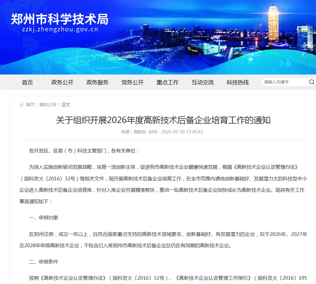 创新是企业发展的源动力,而成为高新技术企业则是科技型中小企业的一次重要跃升。郑州市2026年度高新技术后备企业培育工作已正式启动,2026年.2027年.2028年有准备申请高新技术企业的老板们,必须先入高企培育库,否则不予推荐。近日,郑州市科技局发布了《关于组织开展2026年度高新技术后备企业培育工作的通知》。根据《高新技术企业认定管理办法》等相关文件,郑州市将在全市范围内遴选创新基础好、发展潜力大的科技型中小企业,进入“高新技术后备企业培育库”,为未来三年的高企申报做好准备。培育目标与对象:谁能搭上这班“培育快车”?