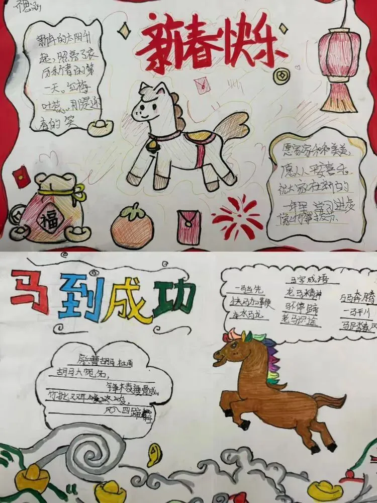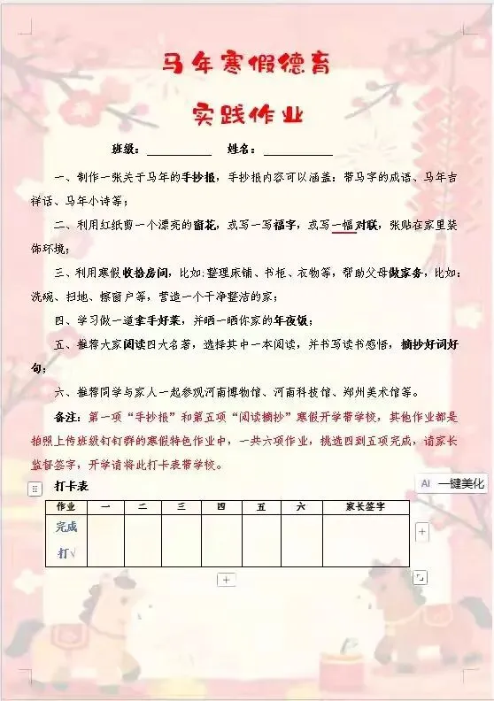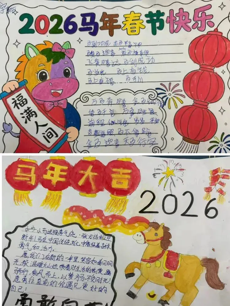 本次寒假德育实践作业以“马年”为主题,围绕文化传承、劳动实践、阅读成长、社会参与四大方向设计了六项特色任务,要求学生自主选择4-5项完成。作业形式丰富多元,既包含手抄报、剪纸书法等传统文化创作,也涵盖家务劳动、厨艺实践、名著阅读、场馆参观等实践体验,充分体现了“五育并举”的育人理念。