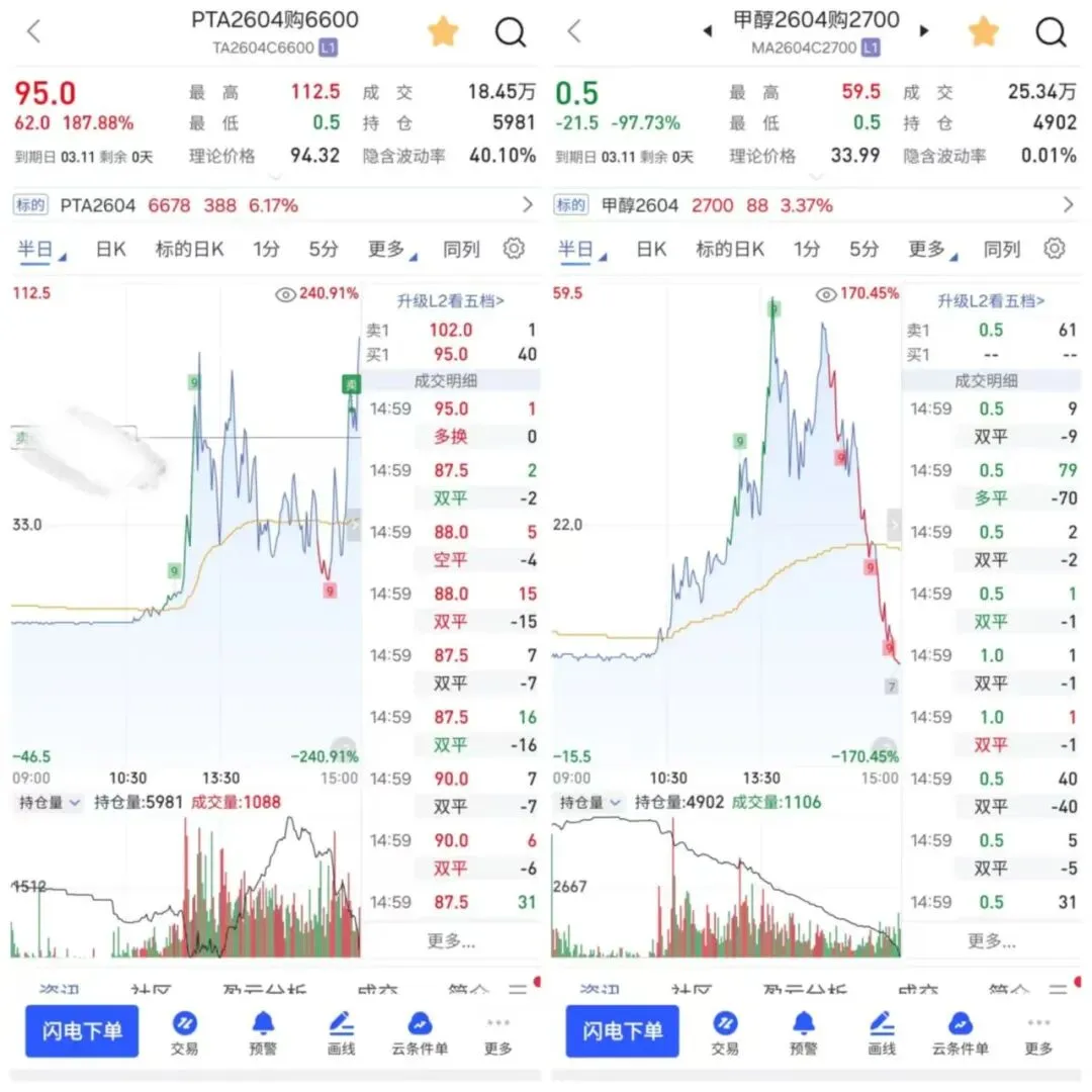 基于对市场高位震荡的预判,我本想借助化工反弹行情布局卖方策略,在甲醇与 PTA 之间,最终选定 PTA 作为交易标的。但盘面极端行情频发、多品种触及涨停,也让我再次深刻体会到:永远不要轻易逆着市场情绪操作。