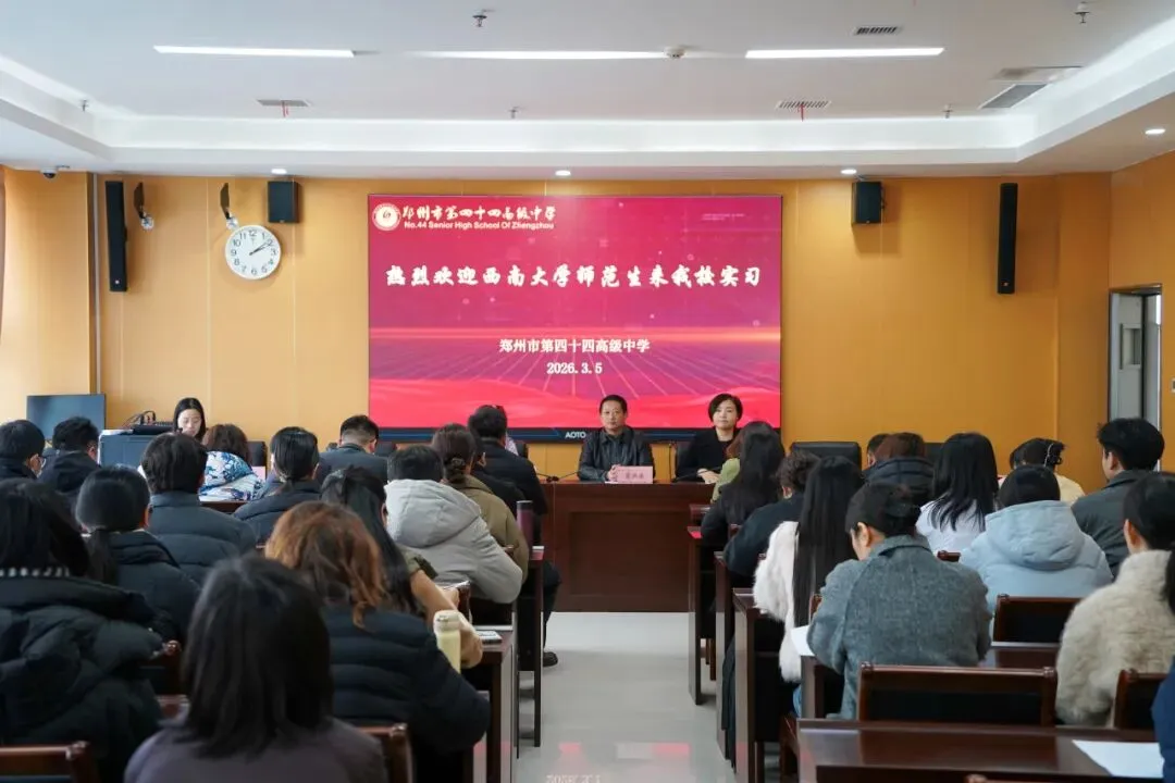 3月5日,郑州市第四十四高级中学隆重举行2026年“实习教师培训启动暨导师结对仪式”,来自西南大学的13名实习教师与学校领导、指导教师齐聚一堂,共同开启为期近四个月的教育实践成长新征程。