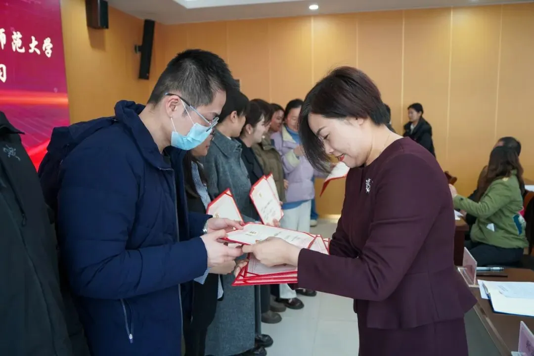 随后,仪式进入庄重的“薪火相传共育新苗”师徒结对环节。13名实习教师依次向各自的学科指导教师与班主任指导教师正式缔结师徒之约。紧接着,校领导为全体指导教师颁发聘书,感谢他们在青年教师培养事业中的责任担当与无私奉献,一份份聘书也承载着学校对导师们履职尽责的殷切期许。