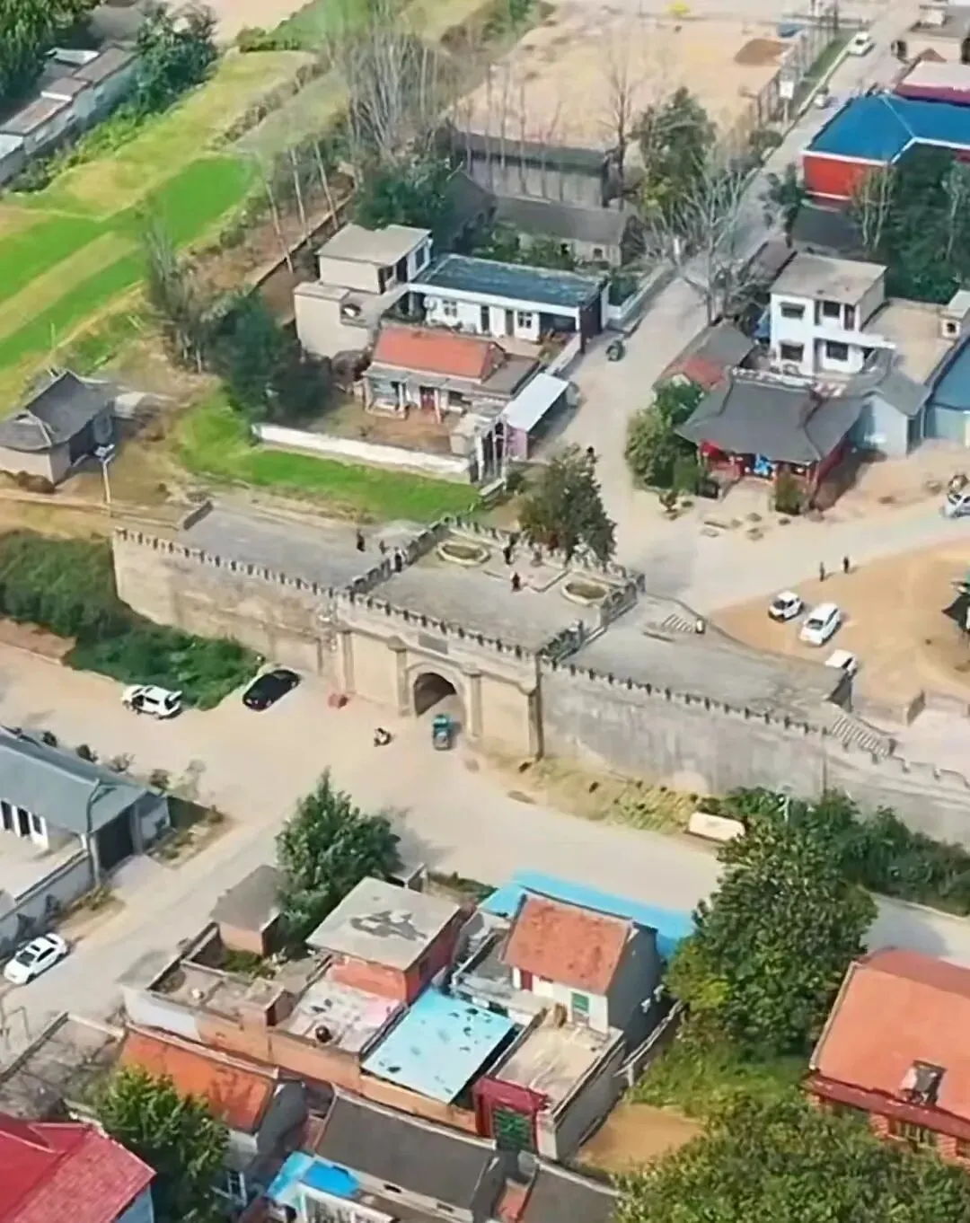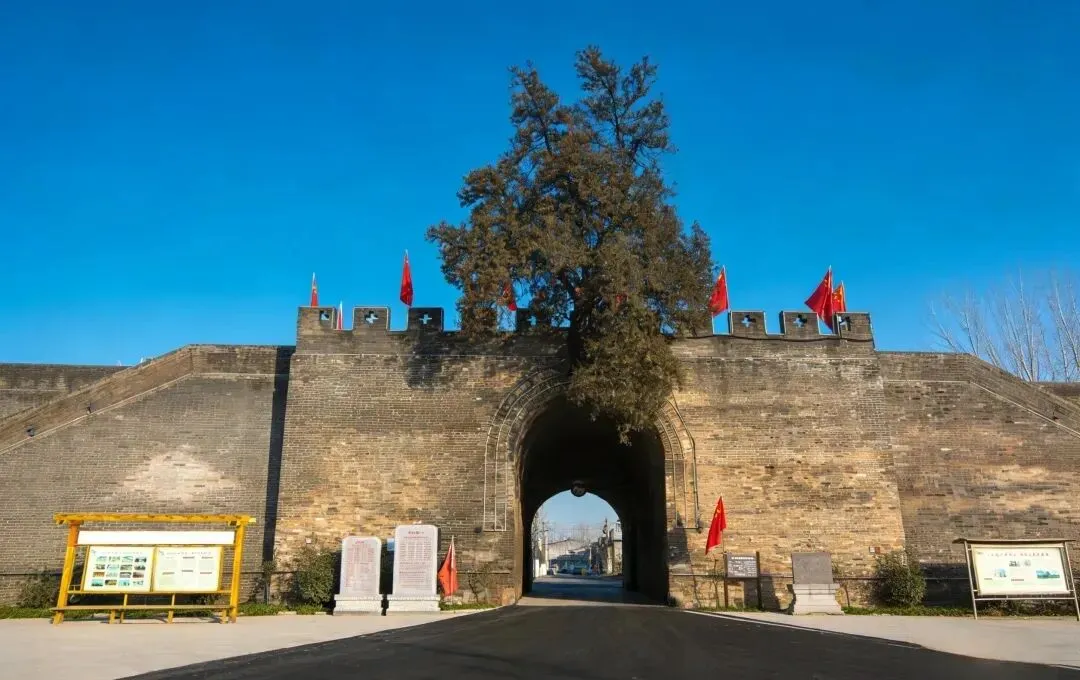 漫步洧川古镇,最震撼人心的莫过于那座屹立六百年的明代南城门——洧阳门(原名镇洧门)。这座始建于明景泰元年(公元1450年)的古城门,东西宽7米,进深13.5米,高10米,以青石为基、青砖为墙,半圆形拱券门气势恢宏,门楣上“洧阳门”三个大字苍劲有力,历经数百年风雨依旧清晰可辨。作为河南省文物保护单位,它是洧川古城的标志性建筑,也是中原地区保存最为完整的明代城门之一。最令人称奇的是,城门通道内侧正顶端的砖缝之中,竟生长着一棵五百余岁的古柏,虬枝盘旋,枝繁叶茂,如一只金凤凰亭亭玉立,俯瞰着古城的四季更迭。相传昔日北门城楼上亦有一棵古榆,与南门古柏遥相呼应,便有了“洧川南门到北门,柏(百)里有余(榆)”的千古典故。这棵古柏与城墙共生,根须深嵌青砖之中,见证了古城的兴衰荣辱,成为洧川坚韧不拔、生生不息的精神象征。抚摸着城墙上斑驳的青砖,指尖划过岁月的痕迹,仿佛能听见明清时期车马辚辚、商贾往来的喧嚣,看见守城将士戍卫家园的坚毅身影。