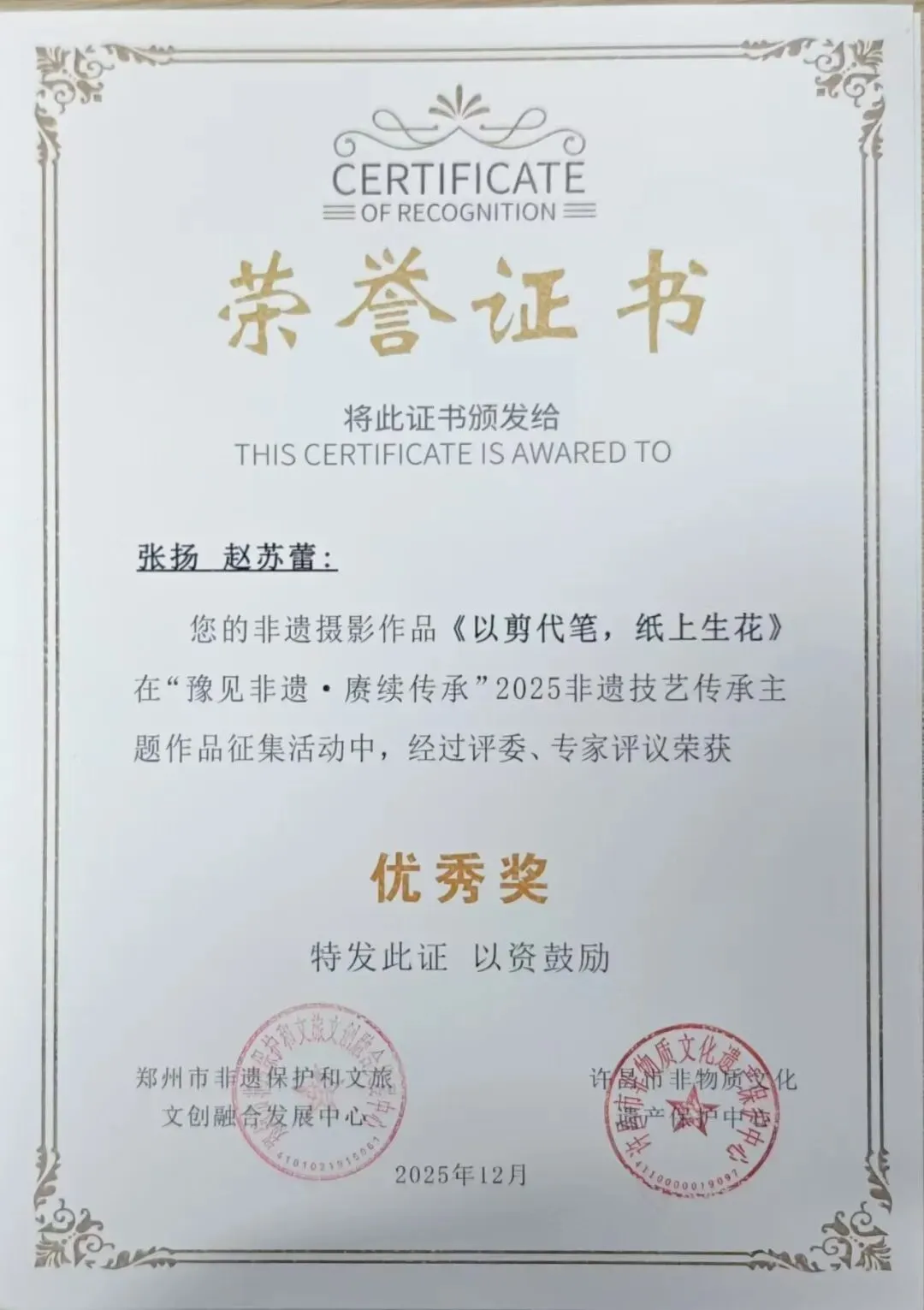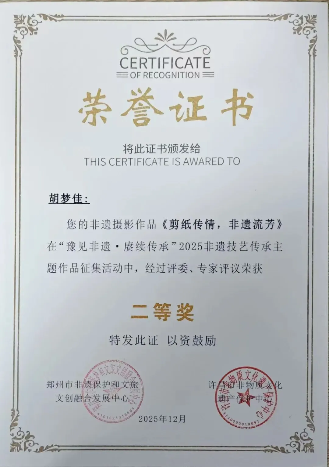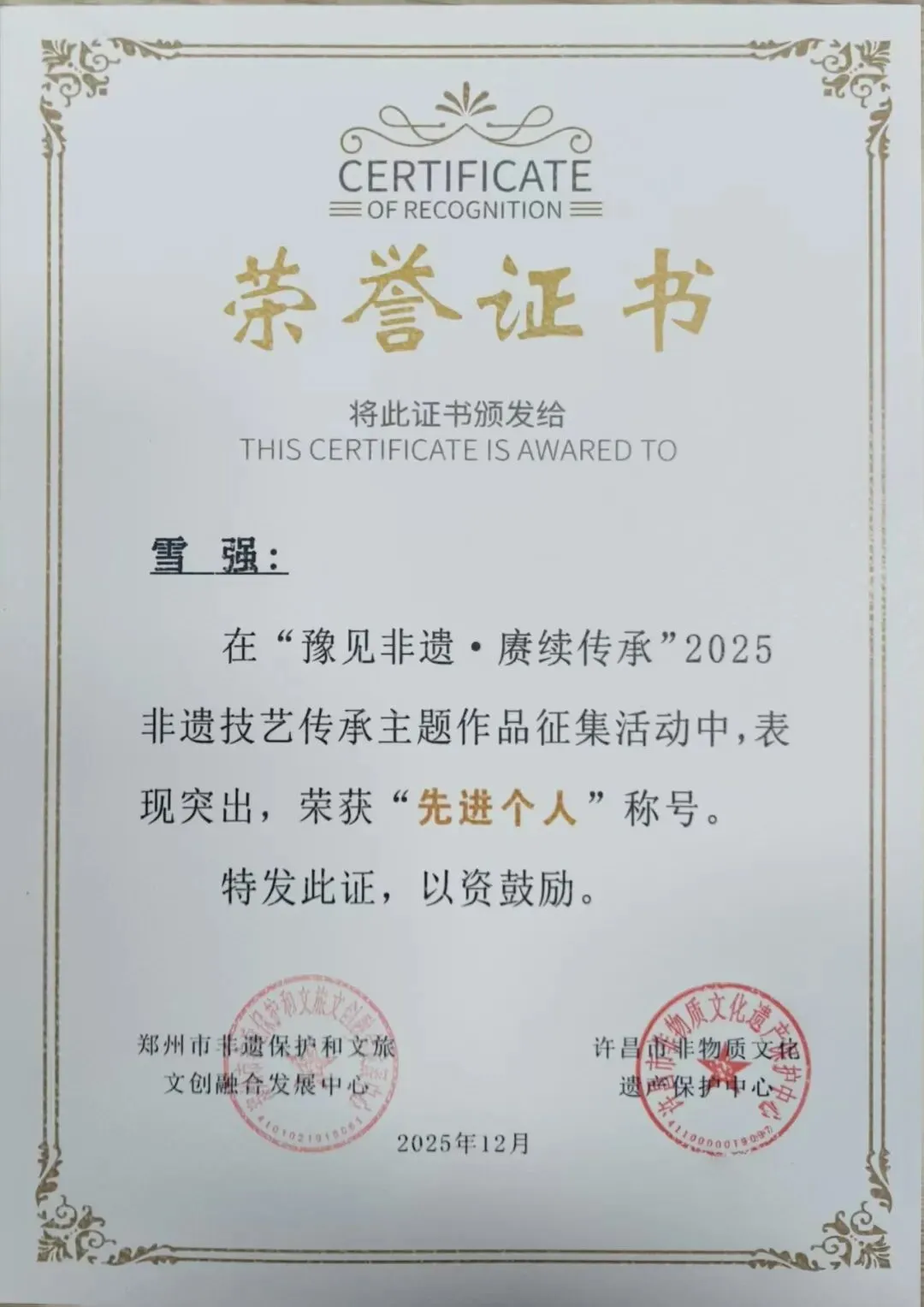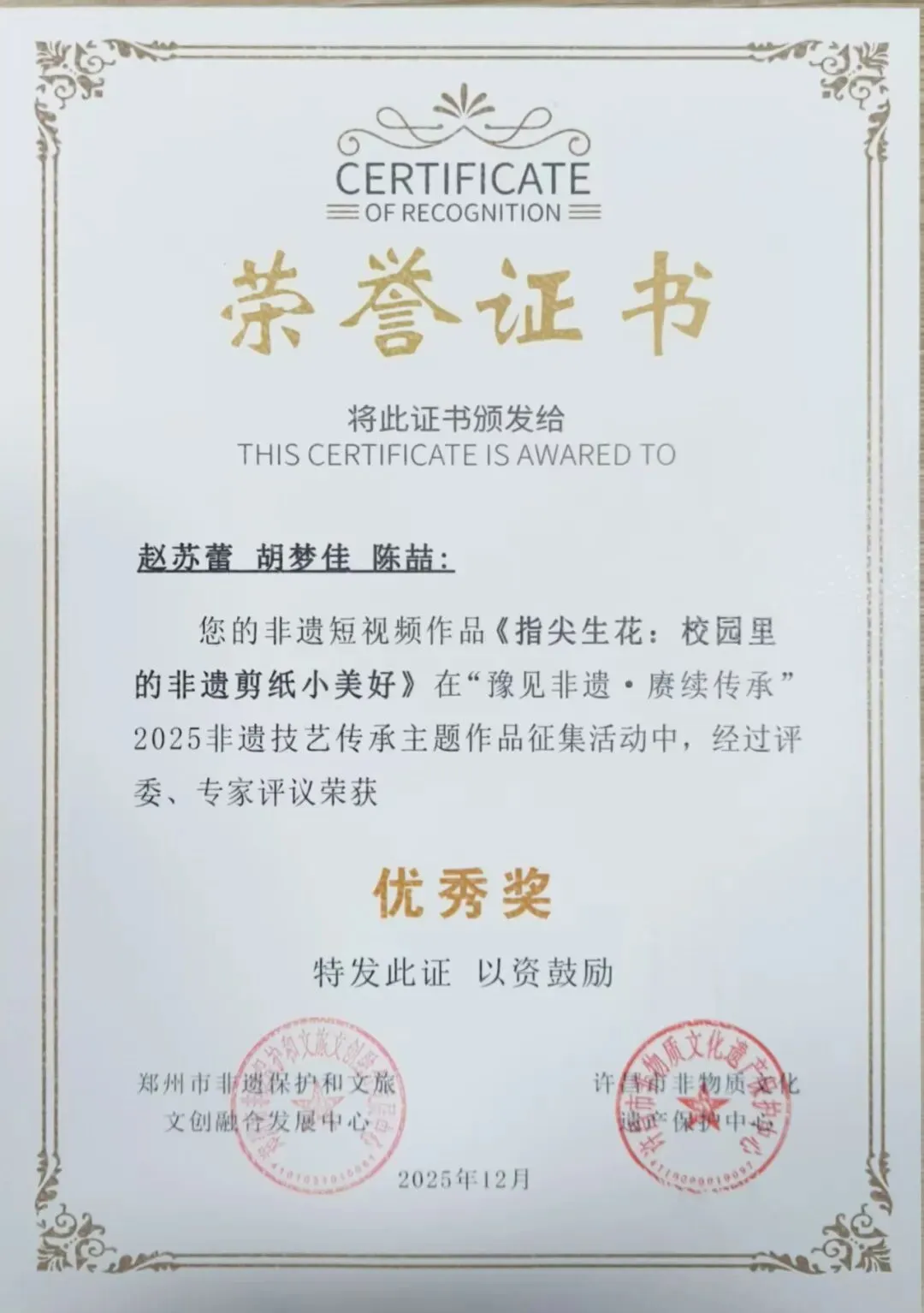 近日,由郑州市非遗保护和文旅文创融合发展中心主办的“豫见非遗 赓续传承”2025 年非遗技艺传承主题作品征集活动评选结果正式揭晓。我院精心组织师生参赛,依托专业优势推动非遗文化与设计创新深度融合,最终斩获多项荣誉,充分彰显了学院非遗育人建设与实践创新发展的扎实成效。