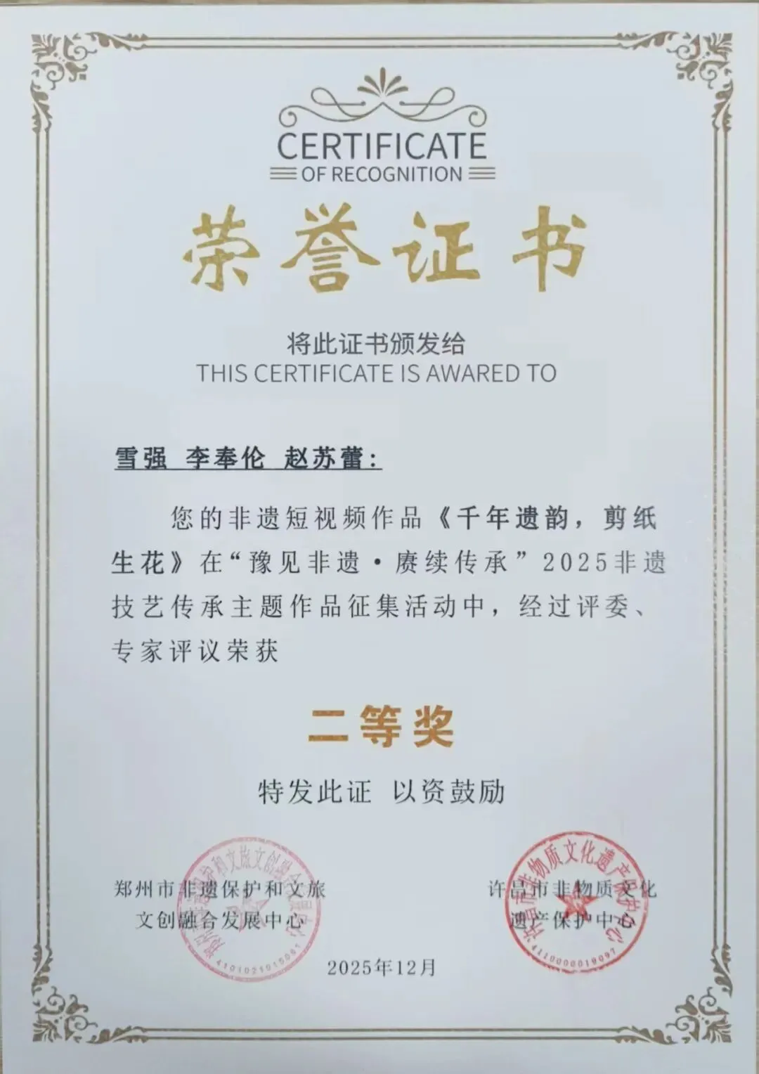 赛事评选中,我院师生奋勇争先、表现亮眼:雪强老师凭借在非遗影像教学领域的深耕积淀与突出的实践育人成果,获评本次活动“先进个人”称号,相关教学实践成果得到主办单位的高度认可;学生群体再创佳绩,共斩获二等奖 6 项、优秀奖 3 项,获奖作品覆盖视频、摄影两大类别,其中,文化创意与策划专业胡梦佳、牛婧涵、赵苏蕾,动漫设计专业王丽芸等多名同学的作品,精准把握非遗本源与现代设计的融合边界,成为本次活动中非遗活化创新表达的标杆之作。