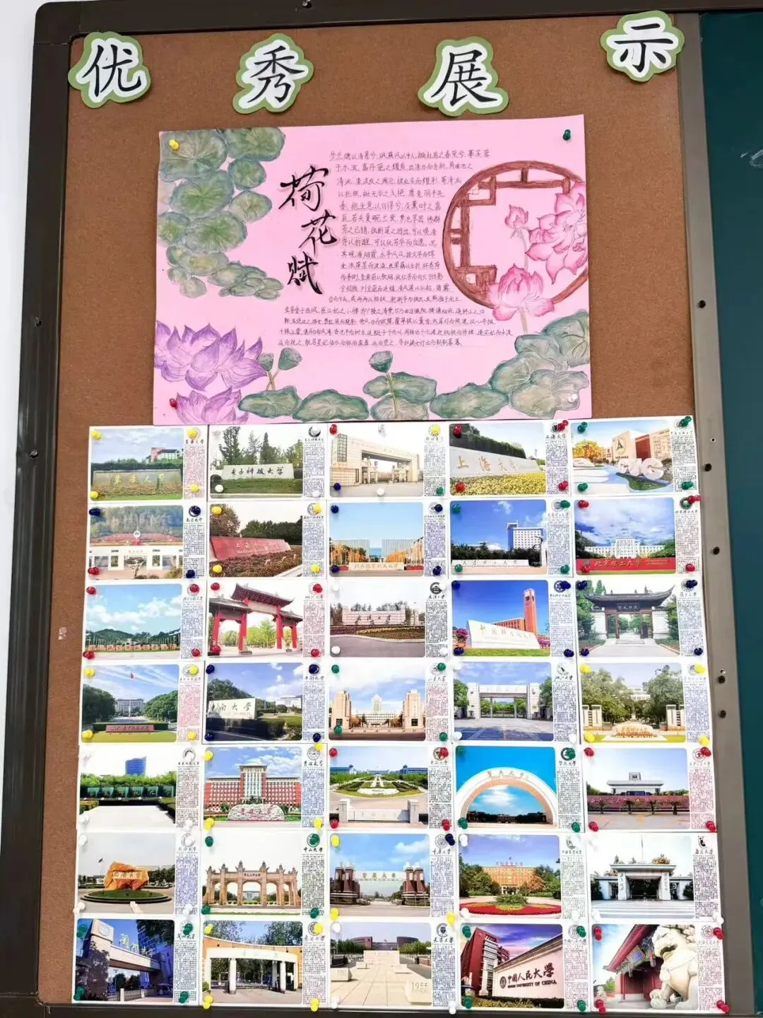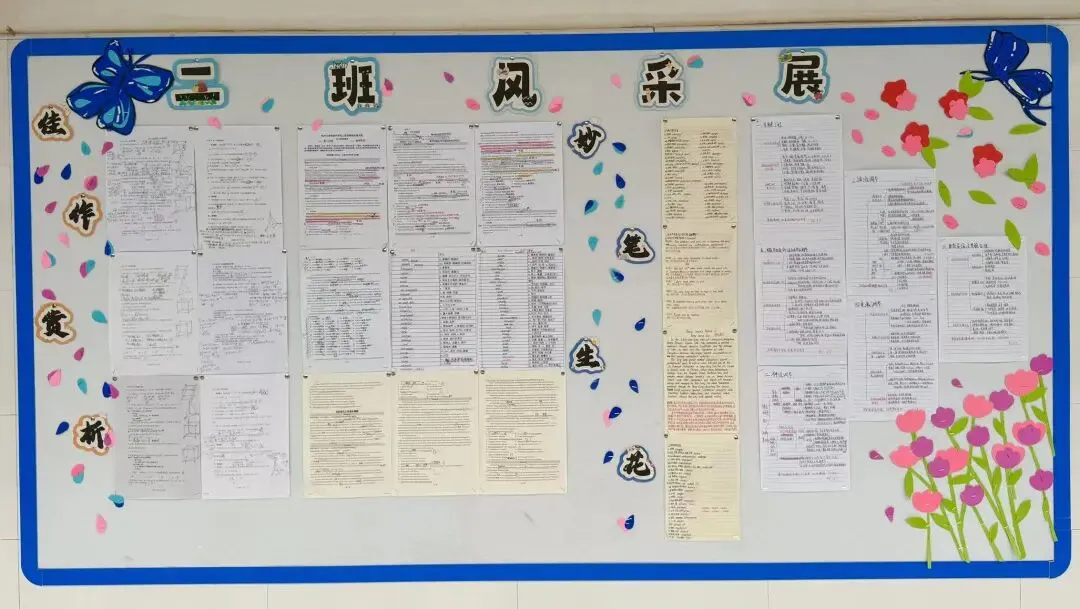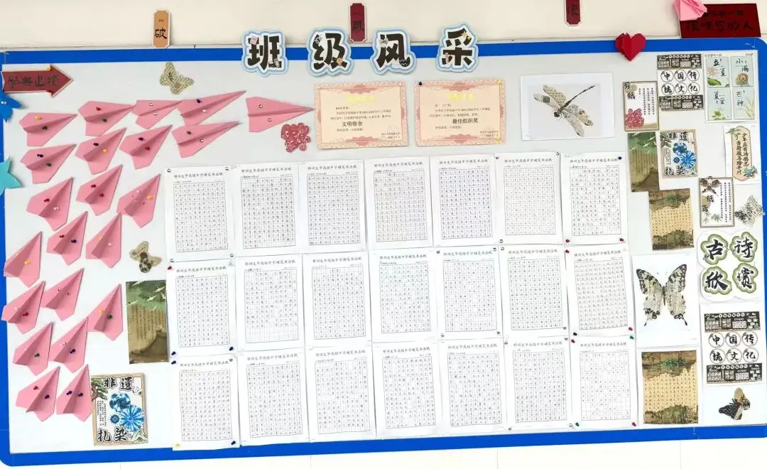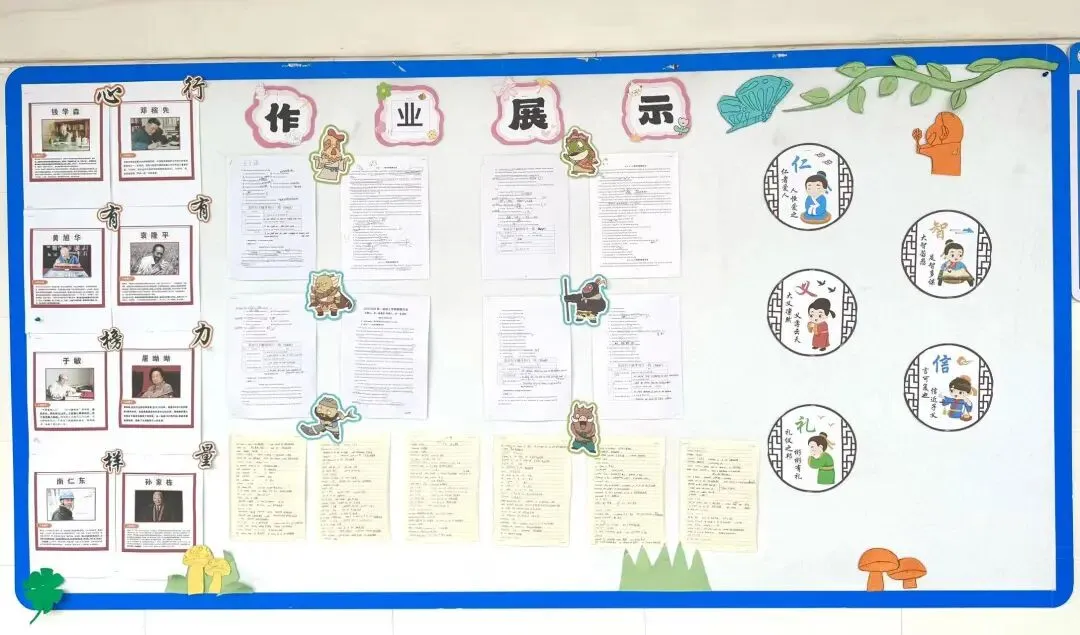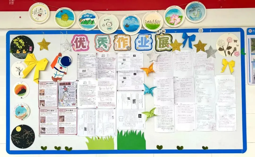 教室外展板整齐陈列优秀作业,一笔一画尽显勤学态度。