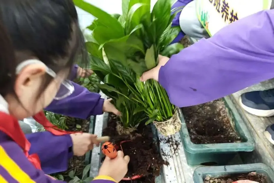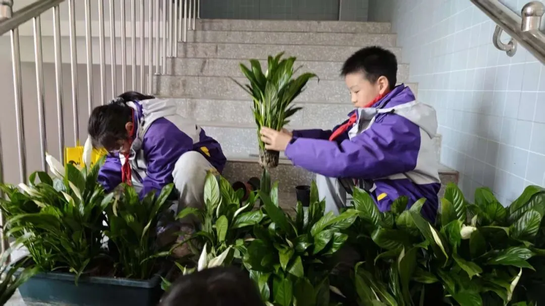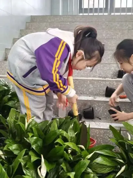 同学们从家中带来小巧的花卉铲和水壶,以志愿者的身份投入劳动。松土、移栽、浇水,每一个步骤都认真细致。白掌舒展绿叶,绿萝安家土中,劳动的喜悦在汗水中绽放。铲声、水声、欢笑声交织,原本安静的角落瞬间沸腾起来。
