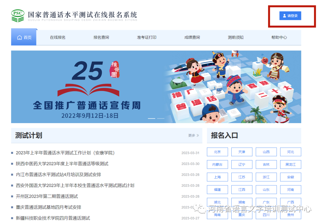 2.报名。考生注册登录成功后,在首页报名入口一栏选择省份“河南”。进入“选择考点”页面后,选择“河南省语言文字培训测试中心”,根据自身安排选择测试时间。