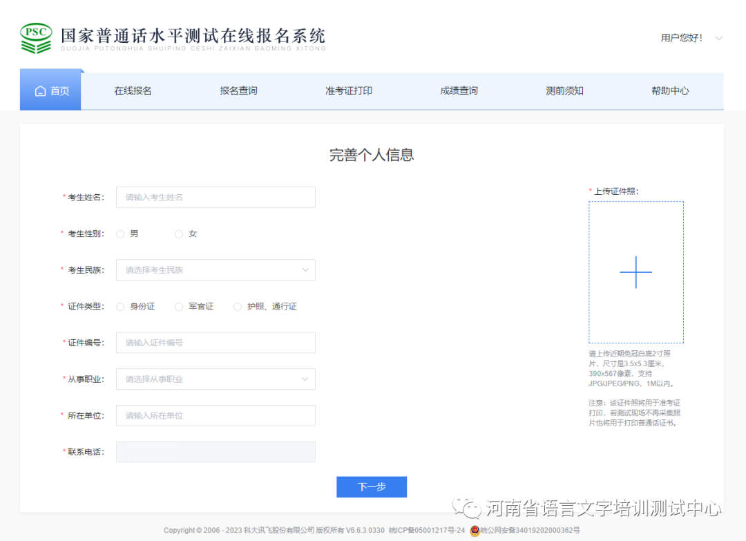填写报名信息时需认真核对报名信息,确认无误后点击下一步。报名成功后报名信息将被锁定,错误信息无法更改,报到时如核对出信息不一致,将取消本次测试资格。