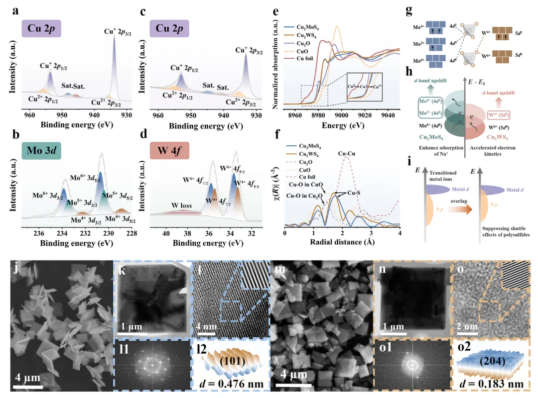 图1 (a-d) XPS图谱证实了Cu₂MoS₄中Mo和Cu的多价态共存(Mo⁴⁺/Mo⁵⁺/Mo⁶⁺和Cu⁺/Cu²⁺),而Cu₂WS₄中主要为W⁴⁺/W⁶⁺和Cu⁺/Cu²⁺,表明Cu₂MoS₄拥有更丰富的变价体系;(e-f) XANES和EXAFS分析显示Cu的价态介于+1与+2之间,且在Cu₂MoS₄中Cu-S键长略长,键能更低,有利于后续转化反应;(g-i) 示意图阐明了多价态导致的d带中心上移机制,Mo的连续d电子构型变化能更有效地优化电子结构,增强与硫的p轨道杂化,从而提升钠吸附能力并抑制多硫化物溶解;(j-o) SEM和TEM图像显示,Cu₂MoS₄呈方形纳米片状,而Cu₂WS₄为多面体形貌,HRTEM进一步确认了二者的良好结晶性及晶面间距。