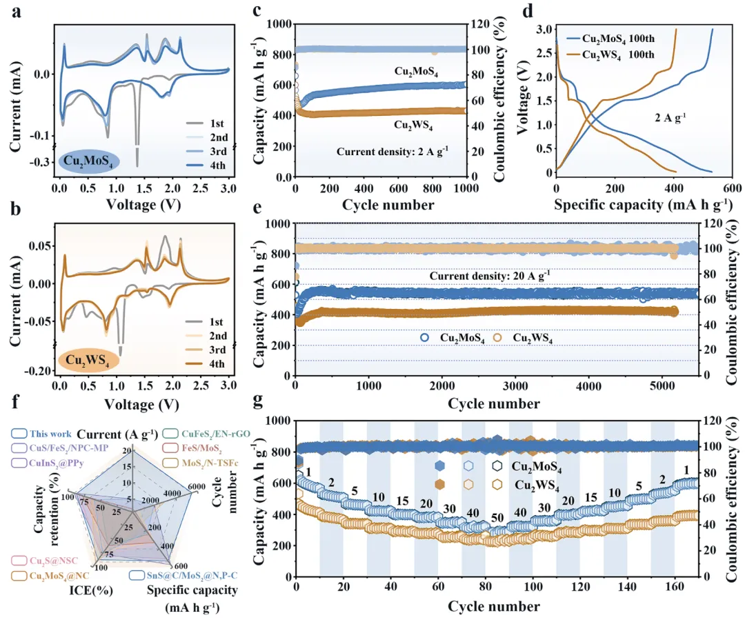 图2 (a-b) 循环伏安曲线揭示了两种材料均经历插层-转化的混合储钠机制,且Cu₂MoS₄中Mo相关转化峰在循环后明显优化,极化减小;(c-e) 循环性能测试显示,在2 A g⁻¹下循环1000次后,Cu₂MoS₄容量保持率达91.5%,远高于Cu₂WS₄的71.8%;即使在20 A g⁻¹的超高电流密度下循环5500次,Cu₂MoS₄仍能保持531.2 mAh g⁻¹的可逆容量;(f) 与已报道的其他铜基/钼基负极材料相比,Cu₂MoS₄的综合性能具有显著优势;(g) 倍率性能测试中,Cu₂MoS₄在50 A g⁻¹的极端电流密度下仍能释放284.6 mAh g⁻¹的容量,且当电流返回至1 A g⁻¹时,容量恢复率高达98.6%,展现出卓越的电化学可逆性。
