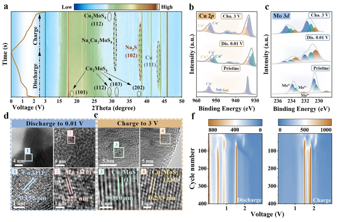 图3 (a) 原位XRD图谱清晰地展示了Cu₂MoS₄在首次充放电过程中的相变:放电时先形成NaₓCu₂MoS₄中间相,随后在0.8 V左右出现Cu和Na₂S的衍射峰,证实了转化反应,充电后部分原始相得以恢复;(b-c) 非原位XPS分析进一步证实了Cu和Mo在充放电过程中的变价行为,特别是Mo在完全充电后仍保持Mo⁶⁺/Mo⁵⁺/Mo⁴⁺的多价态共存,展现了其独特的价态稳定性;(d-e) HRTEM图像直观地展示了完全放电后Cu和Mo纳米晶的出现,以及完全充电后Cu₂MoS₄晶格的重新出现,印证了反应的可逆性;(f) 二维微分容量等高线图显示,随着循环进行,Cu₂MoS₄中Mo⁴⁺/Mo⁰的氧化还原峰强度逐渐增加,表明其反应活性在循环过程中得到持续提升。