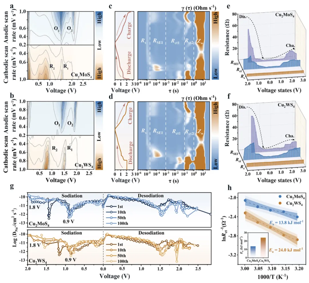 图4 (a-b) 不同扫速下的二维CV等高线图结合后续分析表明,Cu₂MoS₄的电容贡献占比高于Cu₂WS₄,显示出更快的表面反应动力学;(c-f) 基于原位EIS数据及弛豫时间分布技术解析出的阻抗图谱显示,Cu₂MoS₄的电荷转移电阻在200次循环内持续降低,而Cu₂WS₄在50次循环后则出现劣化,表明Cu₂MoS₄具有更优异的界面电荷转移能力和动力学稳定性;(g-h) 恒电流间歇滴定技术计算的钠离子扩散系数和Arrhenius公式拟合的活化能均表明,Cu₂MoS₄具有更快的离子传输速度和更低的反应能垒(13.8 kJ mol⁻¹ vs. 24.0 kJ mol⁻¹)。