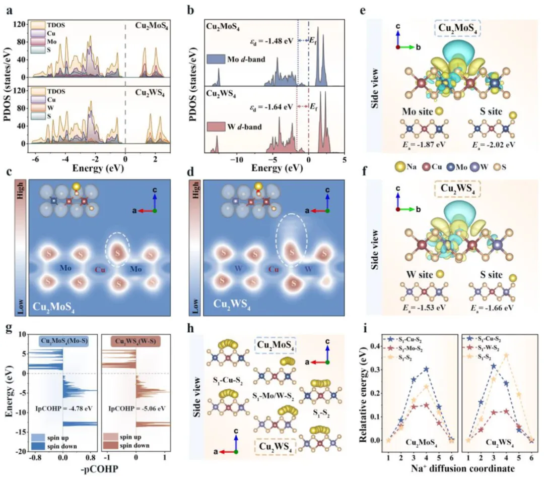 图5 (a-b) 态密度分析表明,Cu₂MoS₄的带隙(1.22 eV)小于Cu₂WS₄(1.62 eV),且Mo的d带中心更高,这有利于提高本征电导率并增强对钠离子的吸附;(c-d) 电子局域函数分析显示,钠离子嵌入后,Cu₂MoS₄中硫原子周围的电子局域化程度显著增强,这是稳定金属低价态、维持多价态共存的微观电子基础;(e-f) 差分电荷密度图直观地展示了Cu₂MoS₄吸附钠离子后引发了更强烈的电荷重新分布,证实了其更强的钠捕获能力;(g) 晶体轨道哈密顿布居分析表明,Cu₂MoS₄中Mo-S键的强度弱于Cu₂WS₄中的W-S键,这有利于结构重组和反应动力学;(h-i) 钠离子迁移路径及能垒计算显示,Cu₂MoS₄具有近乎各向同性的三维钠离子扩散网络和更低的迁移能垒,是实现其优异倍率性能的关键。【结论】