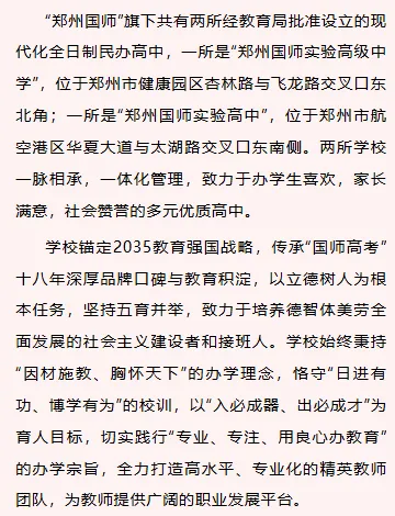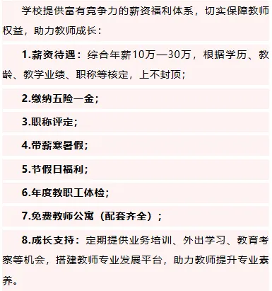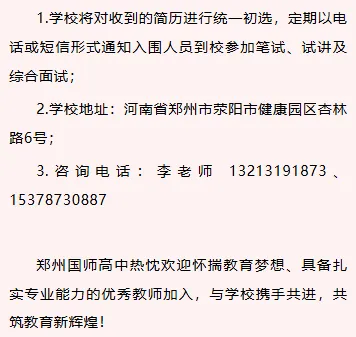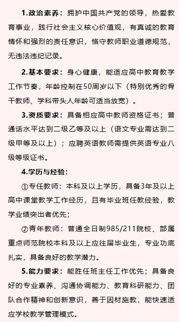 2、我们转推此文,旨在为广大求职者提供信息来源,如需删除,请联系小编。3、请各位求职者提高警惕,凡涉及收取各种费用或几乎不面试就给出录取通知,且到外地就职的招聘等,务必仔细辨别,谨防上当受骗!面向社会公开招聘符合条件的高中各学科专任教师、青年教师,具体学科需求结合学校教学实际统筹安排。