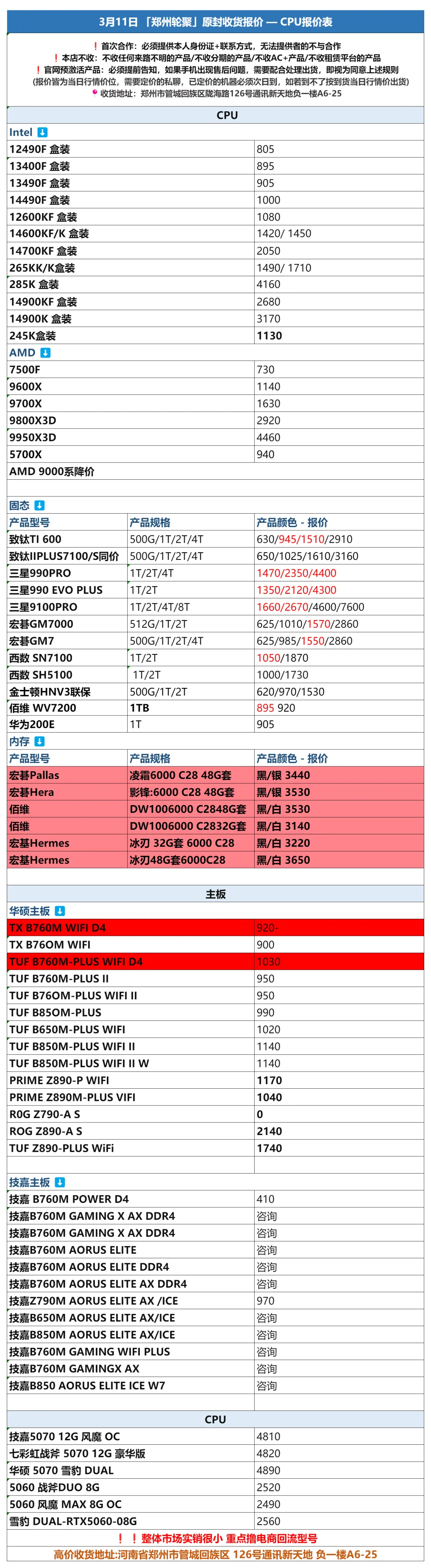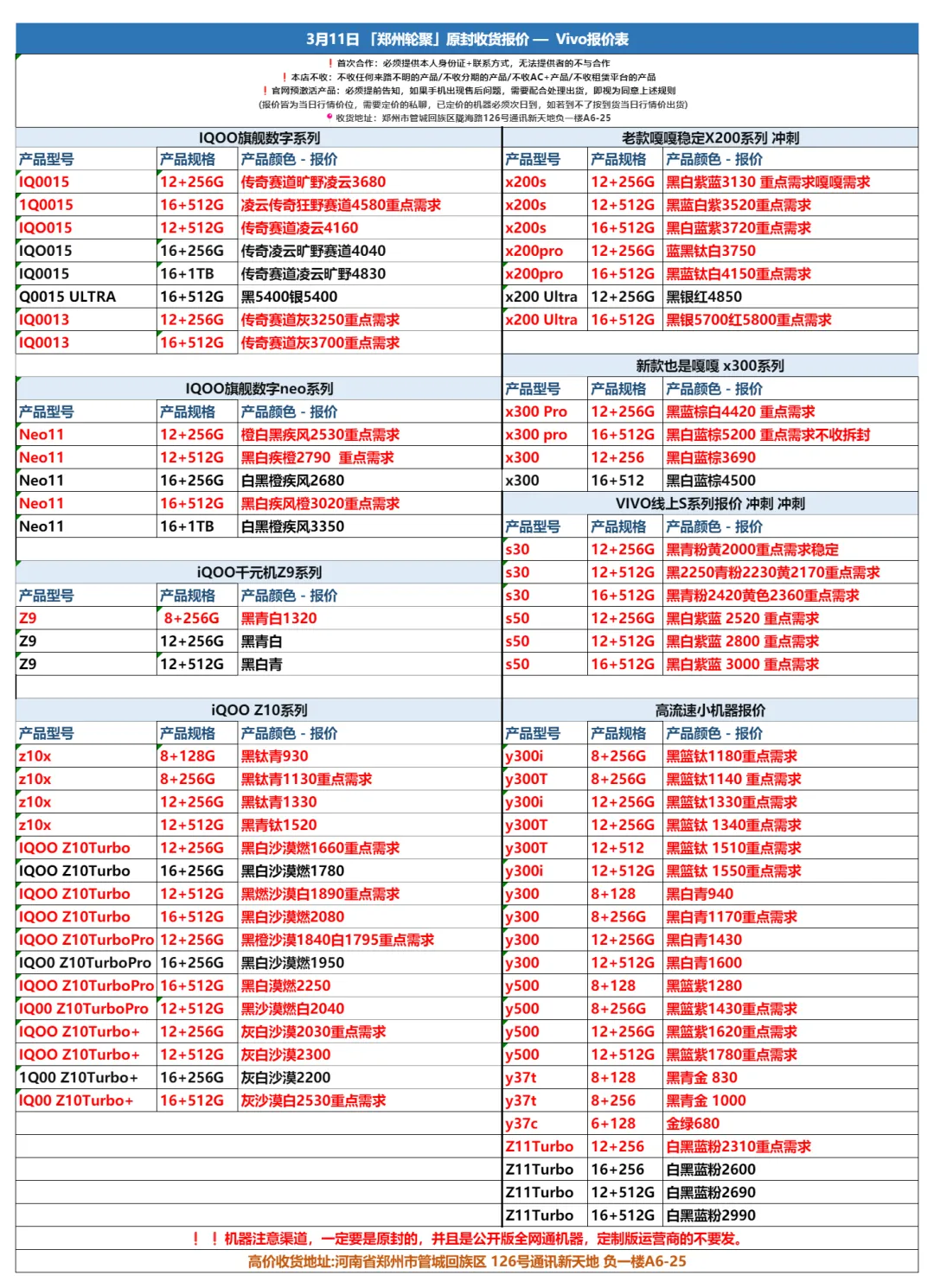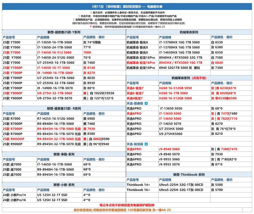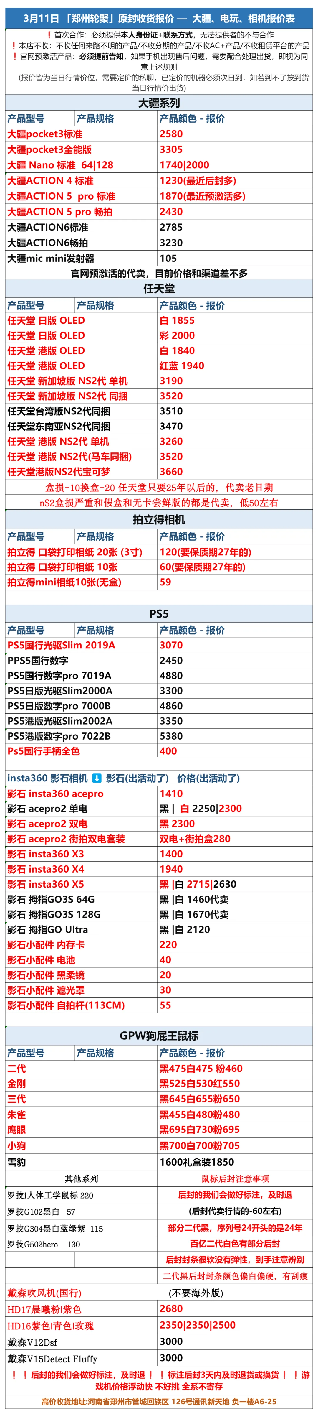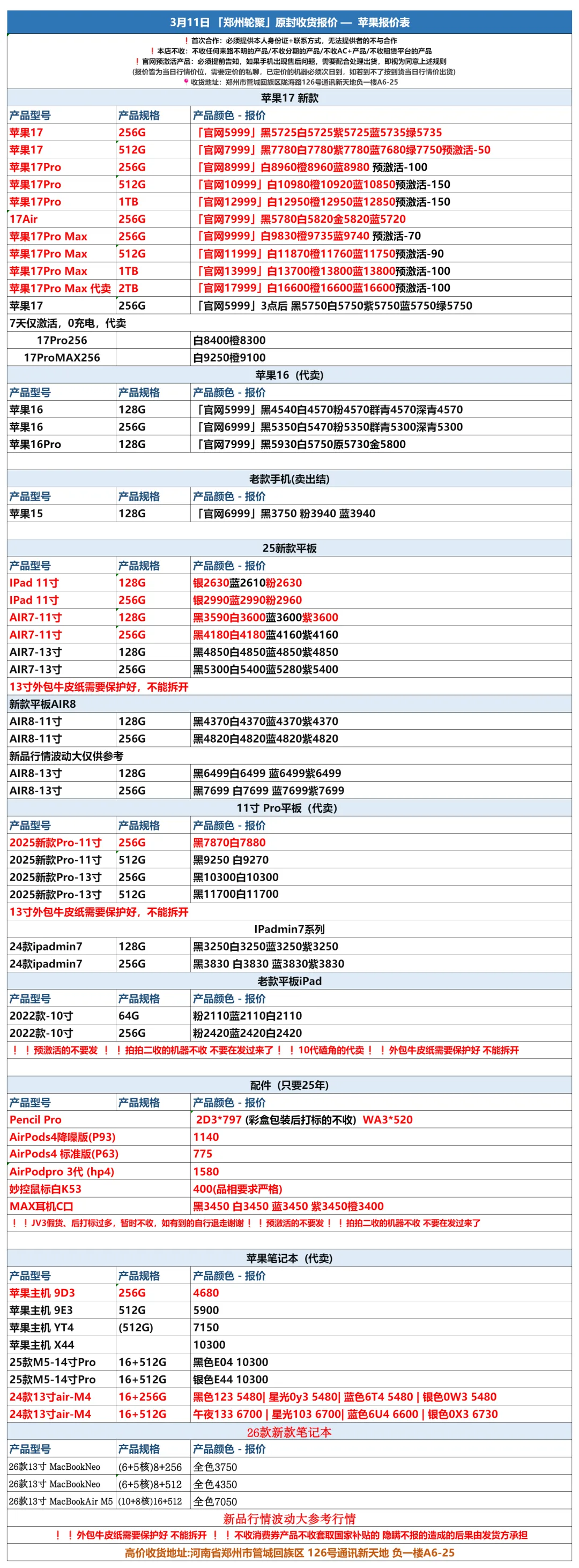 郑州轮聚通讯 2026年3.11日数码报价更新