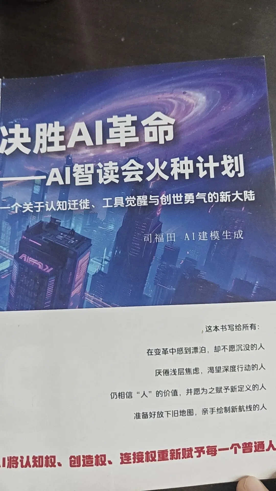 🌈我上周在智读会和几个郑州的老板聊天,做托管的张姐以前每天熬夜写招生文案,现在用AI10分钟出5套方案,还能自动生成朋友圈海报;开打印店的李哥把AI做设计的服务加上,现在的订单比以前翻了一倍。他们说以前总觉得AI是高科技,离自己很远,直到跟着《决胜AI革命》这本书学了才知道:AI根本不是来抢你饭碗的,是来当你24小时不喊累的免费员工的。