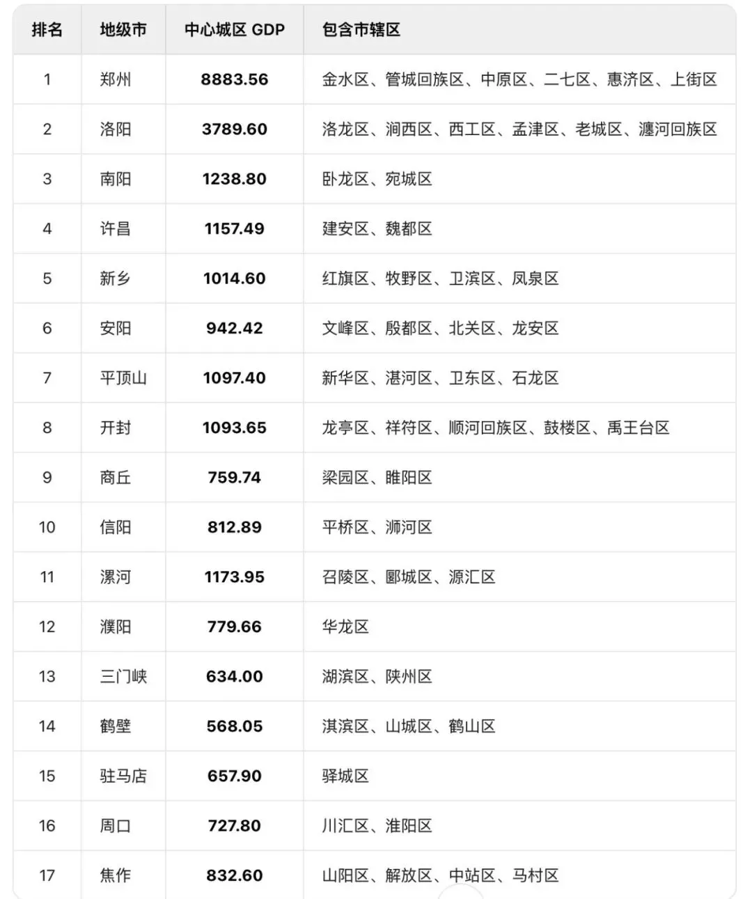 以这个维度来看,以2024年的统计数据为例,郑州市中心城区GDP为8883.56亿元(含郑州航空港区),洛阳中心城区的GDP为3789.60亿元。