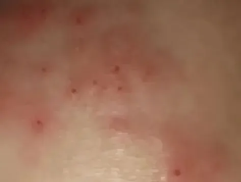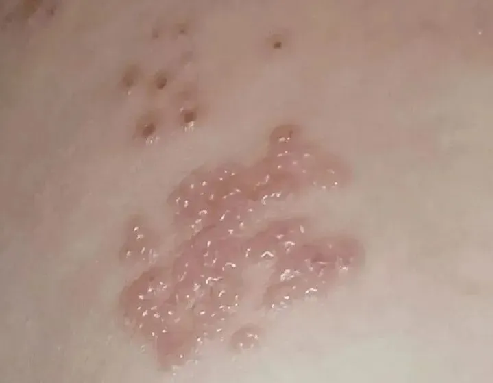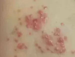 两三天后,患处皮肤出现潮红斑,随后出现成簇状分布而不融合的丘疹,继而变成水疱,水疱周围有红晕表现。水疱随后会干涸、结痂脱落,可能会有色素沉着。