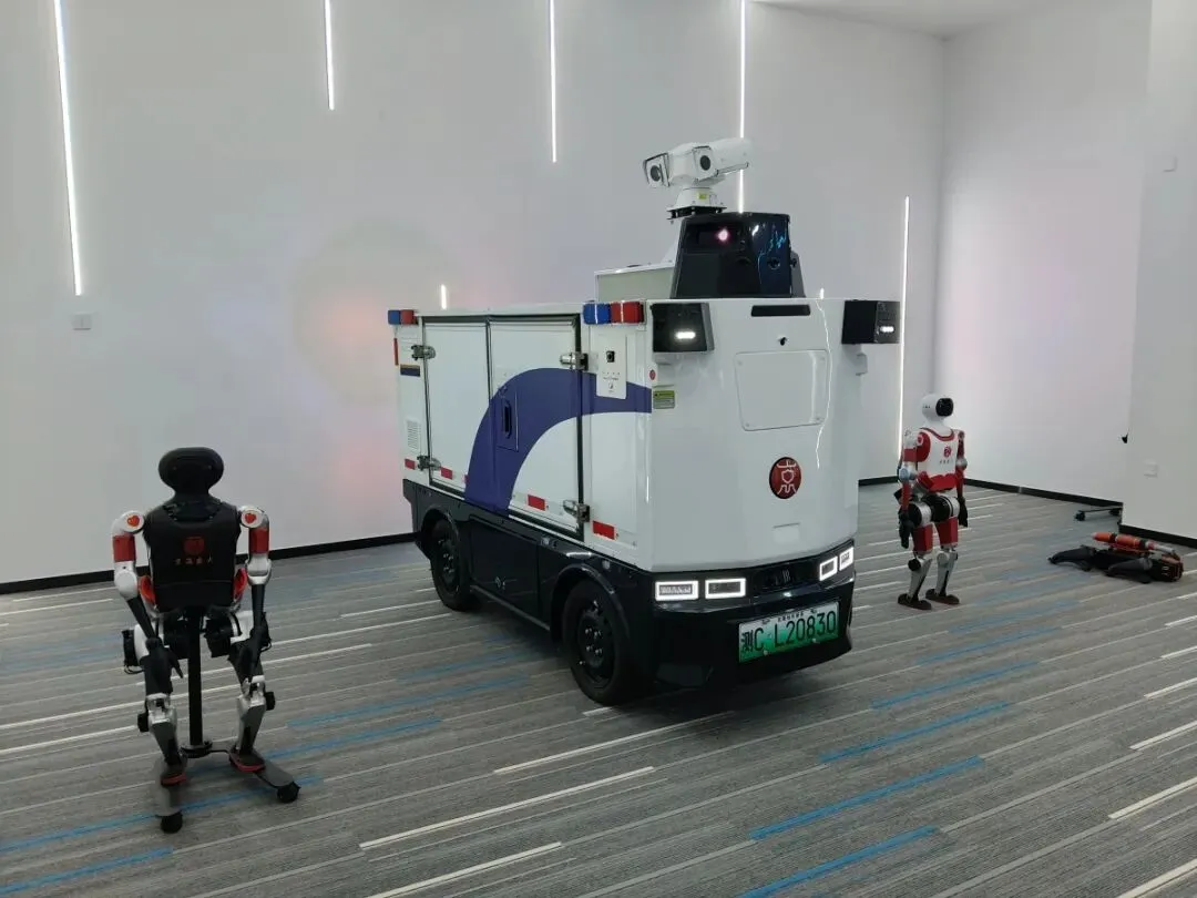 一辆“空地一体”无人巡检车格外吸睛,车身集成高清摄像头、传感器、语音交互系统,车顶可搭载无人机,车身便携智能机器狗,兼具自动巡逻、违停抓拍、行为检测、语音对话等核心功能,还能配备急救医疗包,实现突发事件快速响应,将“高空俯瞰”与“地面机动”无缝衔接。