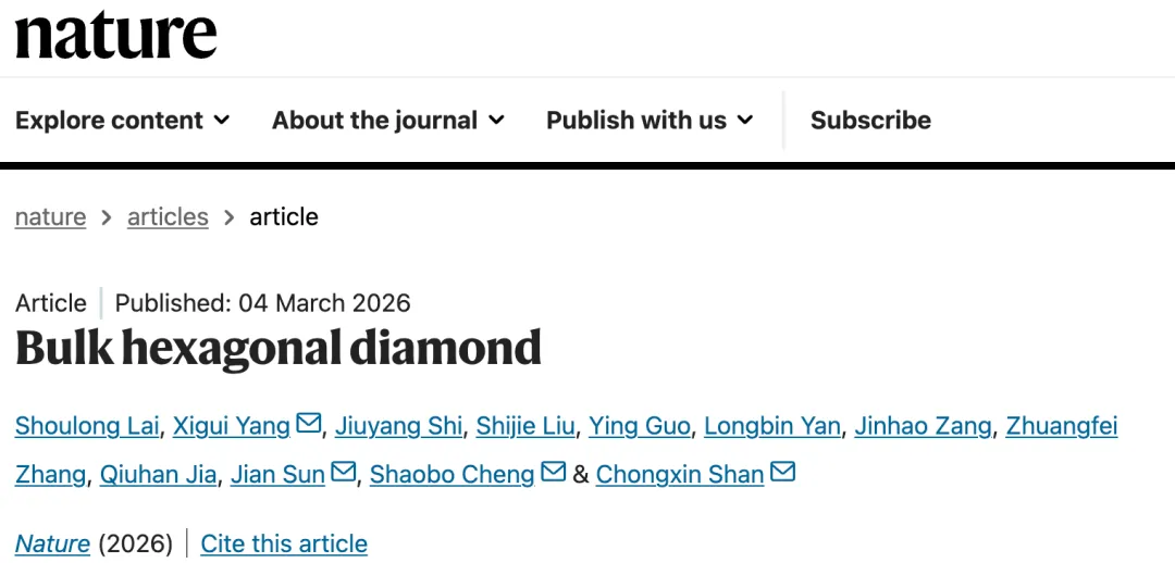 Shoulong Lai et al., Bulk hexagonal diamond, Nature (2026). 链接: https://doi.org/10.1038/s41586-026-10212-4