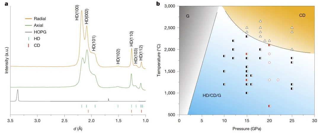 图1:石墨的X射线衍射图谱及压力-温度相图。a图为20 GPa、1300 °C条件下合成的块体六方金刚石的同步辐射X射线衍射(λ=0.6888 Å)图谱,分别沿径向与轴向进行数据收集,同时给出了高度取向热解石墨前驱体的衍射图谱作为对照,底部垂直条代表立方金刚石与六方金刚石的计算衍射位置。b图为石墨的压力-温度相图,红色符号对应本研究中制备的不同样品;半填充方块、空心六边形及空心三角形分别表示含六方金刚石的混合相、纯六方金刚石及纯立方金刚石。