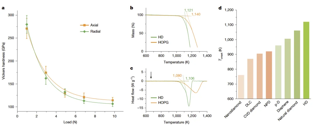图4:块体六方金刚石的力学与热学性能测试结果。a图为六方金刚石的维氏硬度随两个不同方向所施加载荷的变化关系,误差棒表示标准偏差 (n = 5);b、c图分别为六方金刚石与高度取向热解石墨前驱体的热重分析曲线和差示扫描量热曲线;d图为六方金刚石与其他类型金刚石材料的热稳定性对比,其中CVD代表化学气相沉积金刚石,DLC代表类金刚石碳,NPD代表纳米多晶金刚石,p-D代表次晶金刚石。