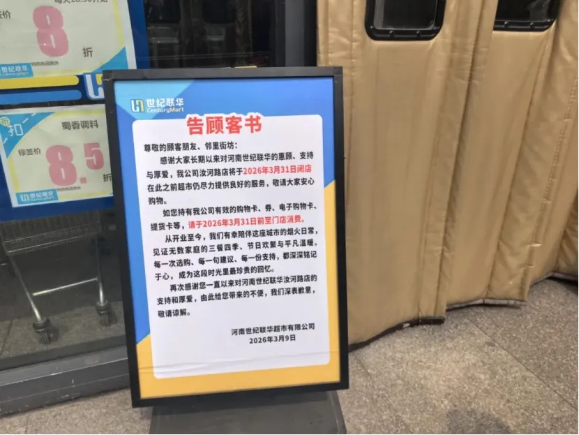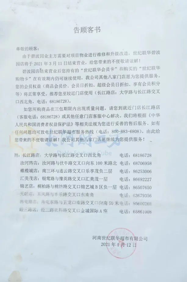 《告顾客书》中称:感谢大家长期以来对河南世纪联华的惠顾、支持与厚爱,称汝河路店将于3月31日闭店,在此之前,超市仍尽力提供良好的服务,敬请大家安心购物。